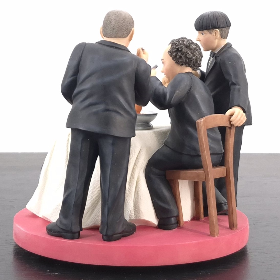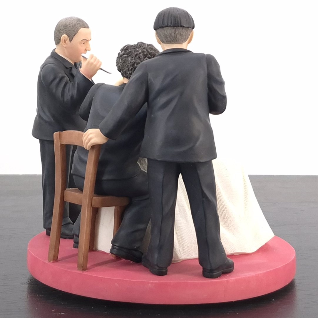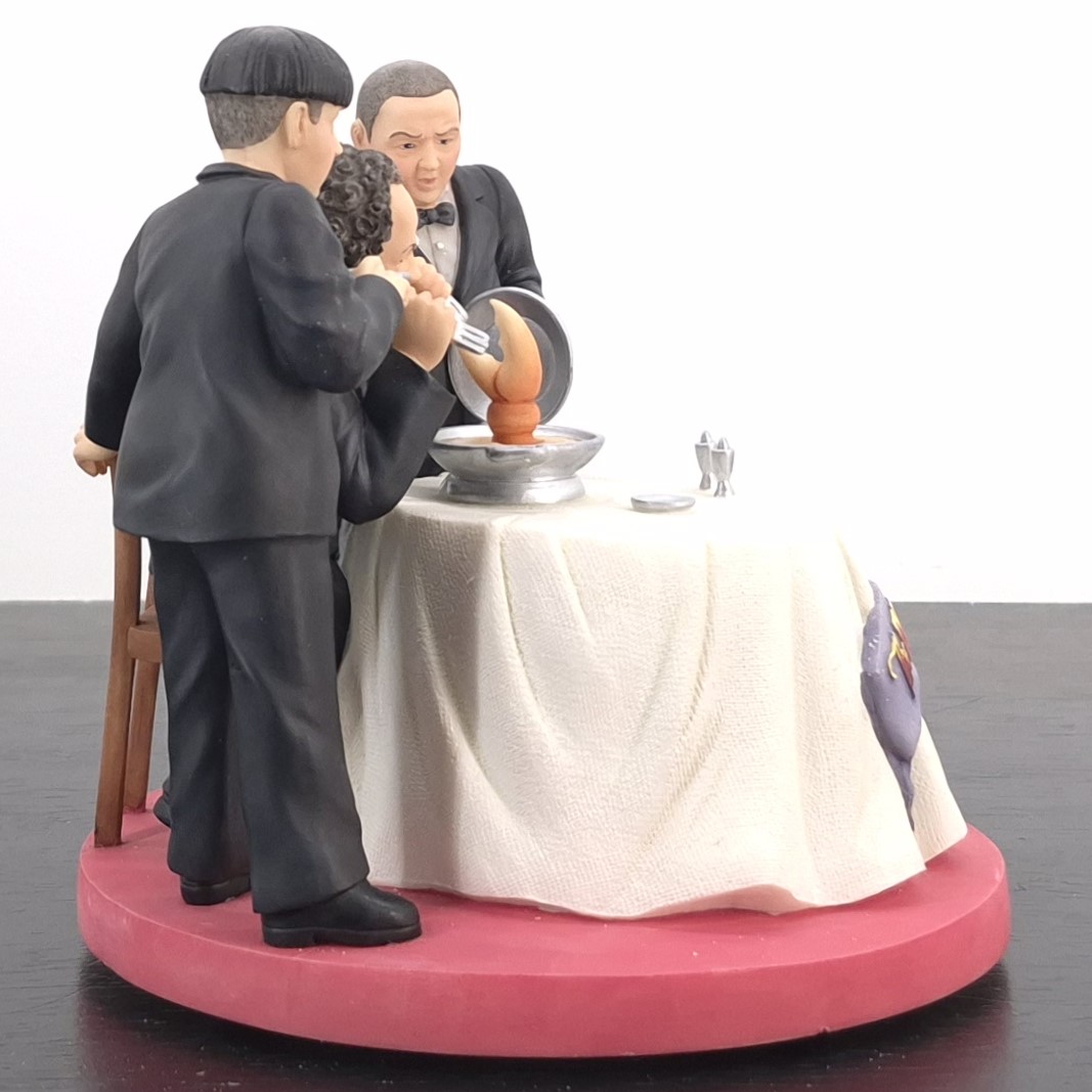 Vintage music box of the The Three Stooges, crafted by Westland Giftware under C3 Entertainment, Inc.’s license. Dates back to 2000. Crafted from durable resin, it remains in excellent condition. Presenting the ultimate collectible for Three Stooges fans: the Three Stooges music box! This charming piece features Larry, Moe, and Curly in a hilarious dining scene, brought to life as it plays “Pop Goes the Weasel.” With intricate details and vibrant colors, this music box captures the essence of the classic comedy trio. Perfect for display in any home or office, it’s sure to bring a smile to anyone’s face.
