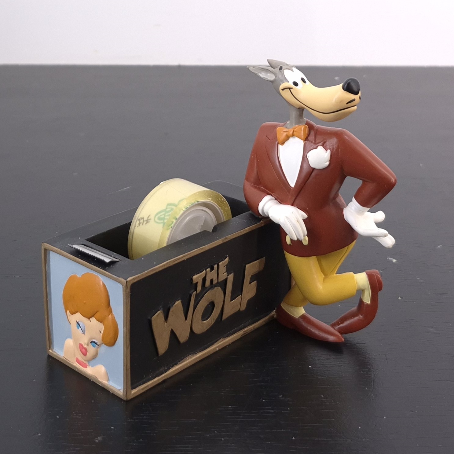 Vintage tape dispenser of the Wolf and the Girl Avery, crafted by Tropico Diffusion under Turner Entertainment’s license. Part of Tropico Diffusion’s Avenue of the Stars collection. Dates back to 2003. Crafted from durable resin, it remains in excellent condition. Unleash classic cartoon cool with this Tex Avery-inspired tape dispenser featuring “The Wolf” in full swagger, leaning casually like he owns the desk. Bold gold lettering on the front declares his name, while the back pays tribute to “The Girl” — the irresistible icon of animated glamour. Her image graces the side in true pin-up style, adding a splash of sass to your workspace. Functional, collectible, and wildly nostalgic, it’s where office supplies meet Looney Tunes legacy. A must-have for fans who like their stationery with a wink and a whistle.