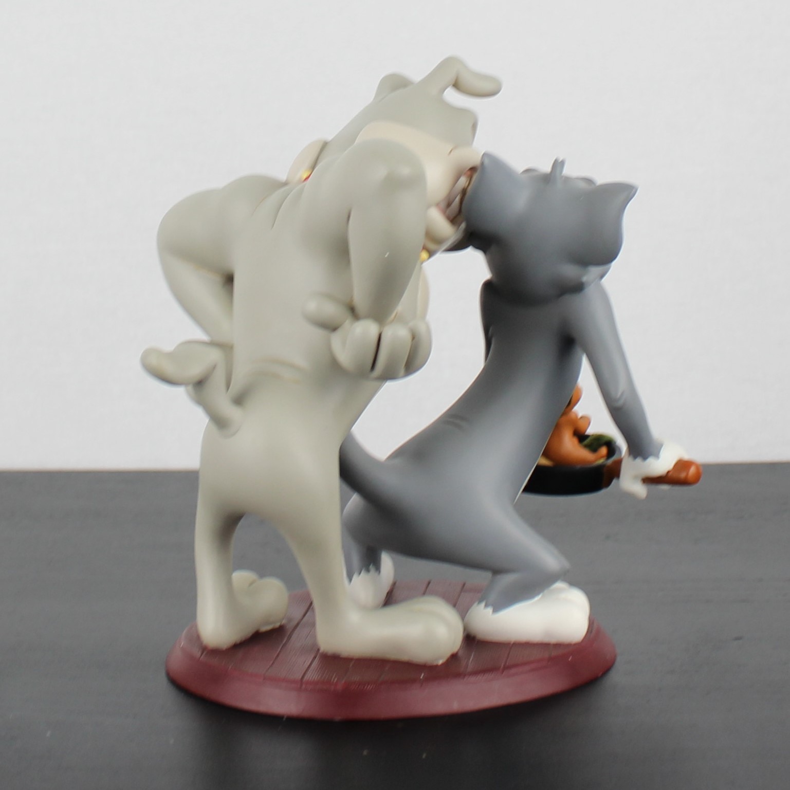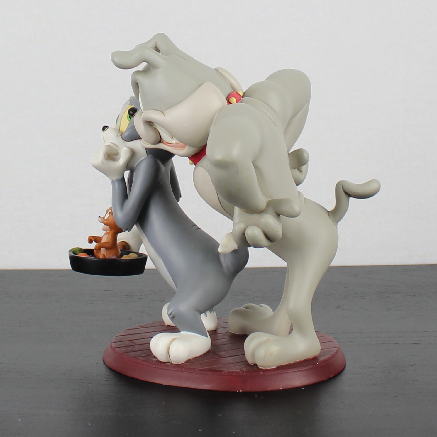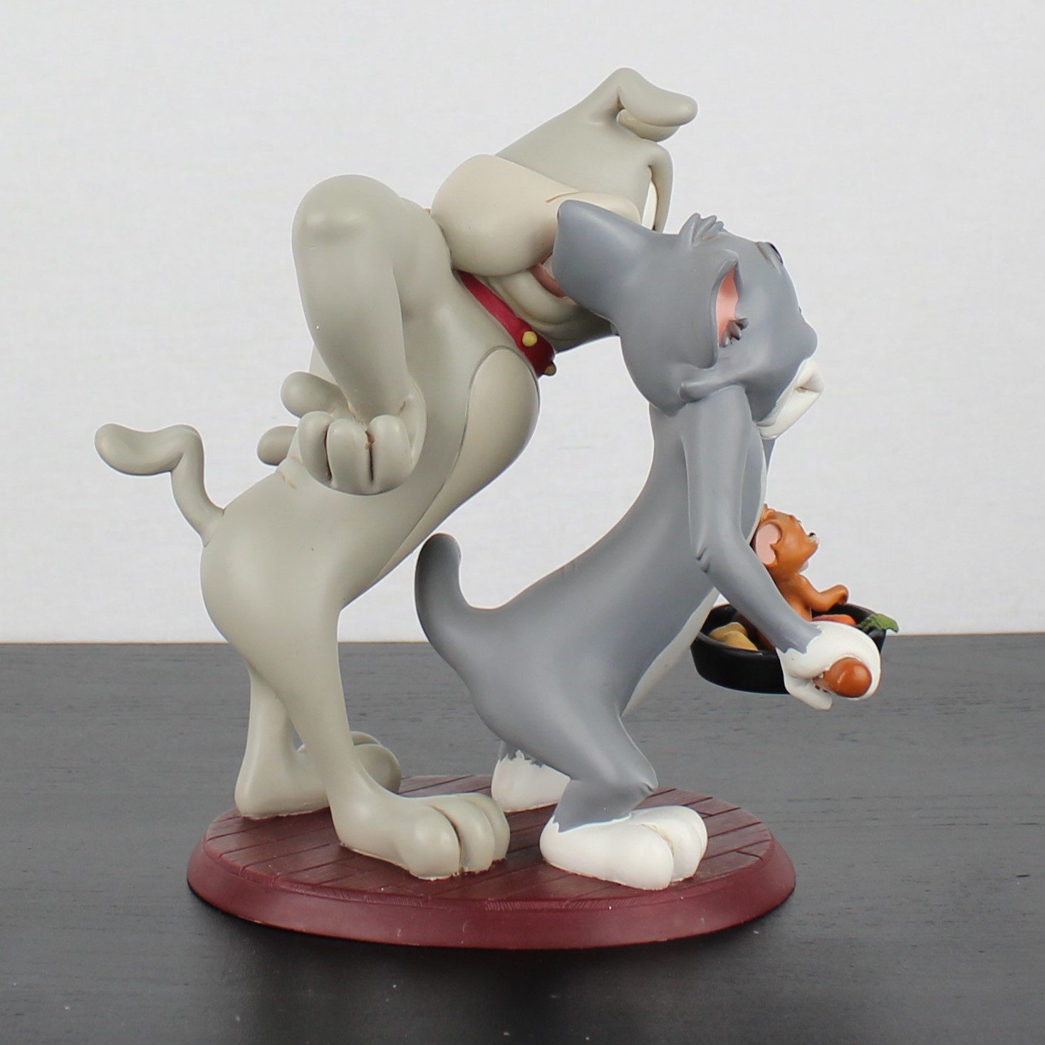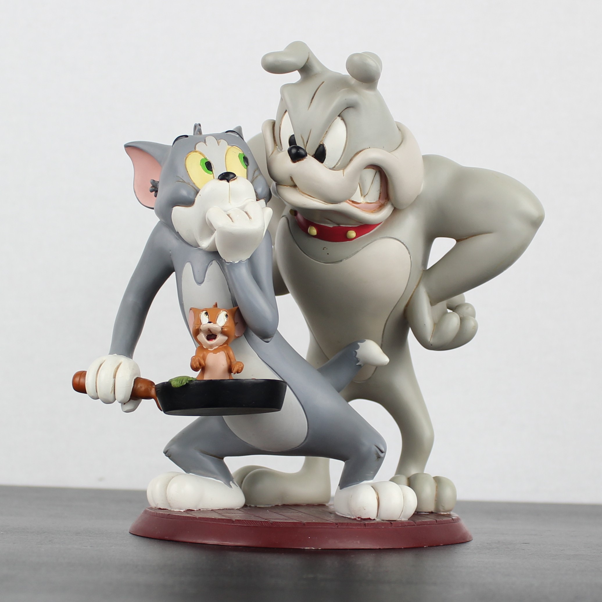 This vintage statue from Tom and Jerry with Spike was sculpted by Peter Mook under Hanna-Barbera’s license. It was taken in production by Rutten. Dates back to the 1990s Crafted from durable resin, it remains in excellent condition. Bring home the hilarious antics of Tom, Jerry, and Spike with this dynamic statue! Featuring Jerry in a frying pan with vegetables, Tom looking startled as he holds the pan, and an angry Spike standing behind him, this piece is perfect for any fan. Add a touch of classic cartoon chaos to your collection, celebrating the timeless mischief of these beloved characters!