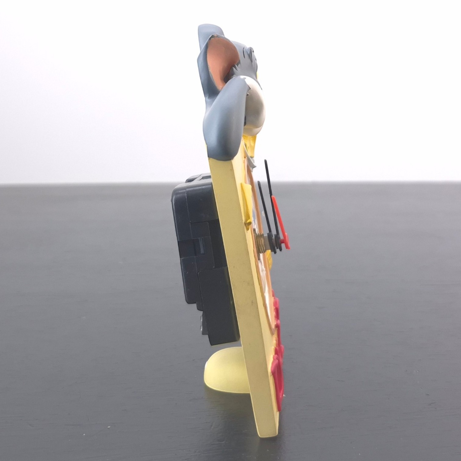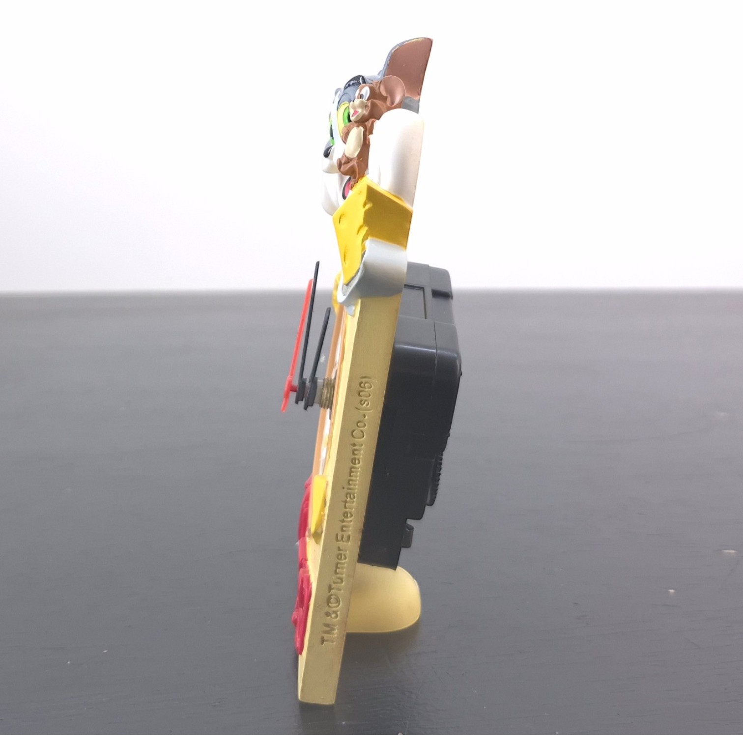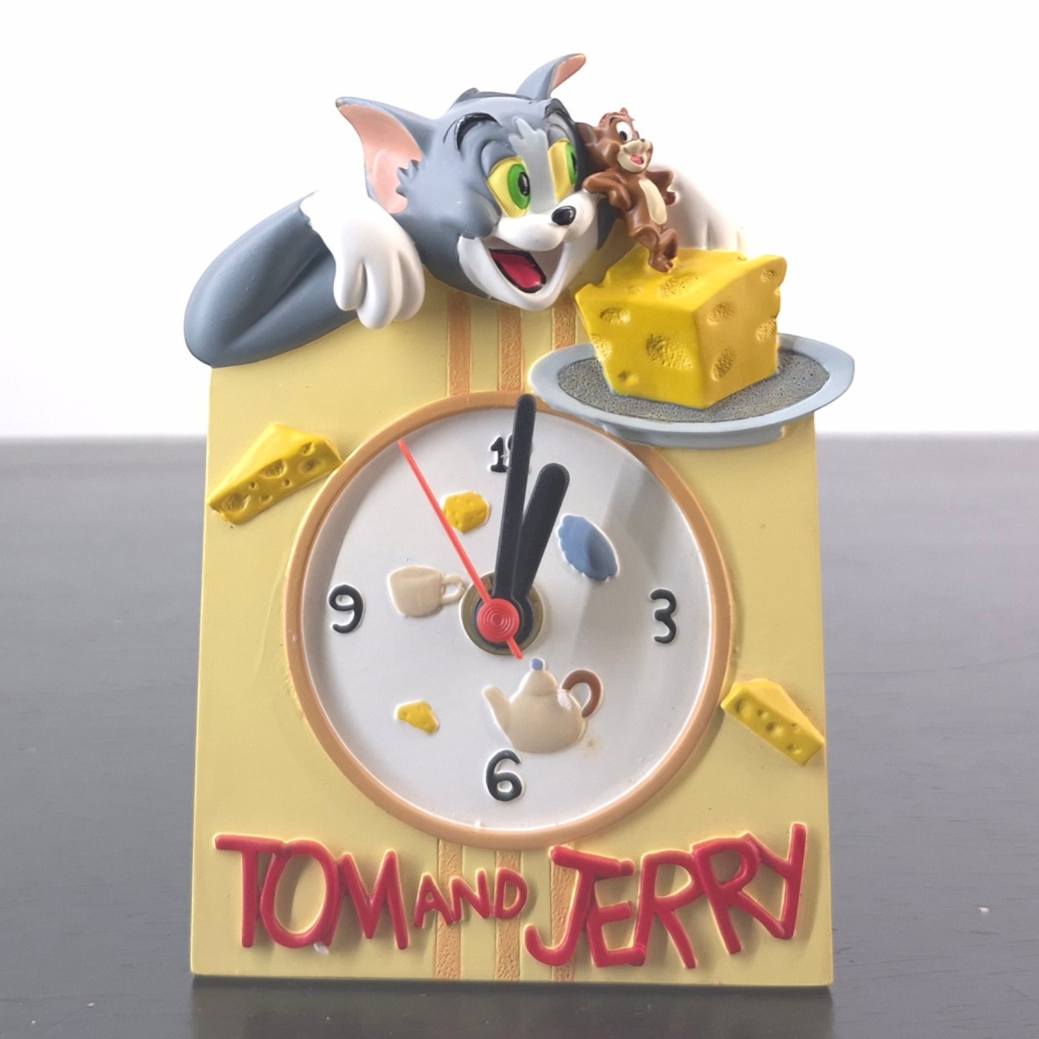 Vintage picture of Tom Cat and Jerry Mouse, crafted by Paben under Hanna-Barbera’s license. Dates back to 2006. Crafted from durable resin, it remains in excellent condition. This Tom and Jerry desk clock turns the classic cat-and-mouse chase into a cheerful display piece, with Tom leaning over the top while Jerry sits beside a large piece of cheese. The clock face is worked into the design with small kitchen and cheese details, giving the piece a playful cartoon look without losing its practical function. Its colourful character scene makes it well suited for a Tom and Jerry collection, animation memorabilia display, or playful desk setup.