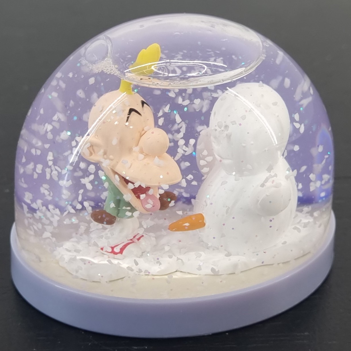 Vintage snow globe of Tootuff, crafted by Demons and Merveilles under Zep’s license. Dates back to the 1990s. Crafted from durable PVC, it remains in excellent condition. Shake up some laughter with this snow globe where Tootuff has mischievously moved the snowman’s nose lower, giving it a rather ‘unique’ look – and Tootuff can’t stop laughing at his own frosty prank!