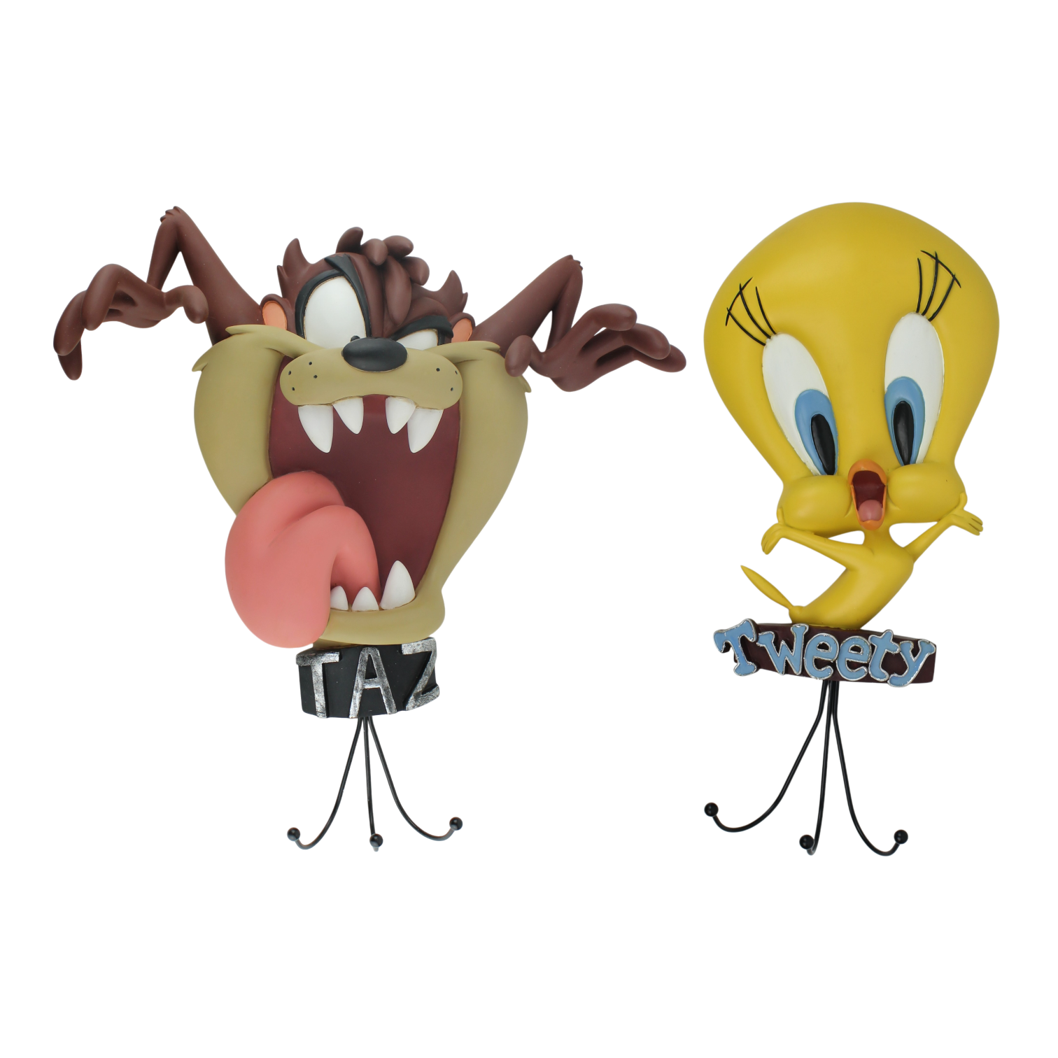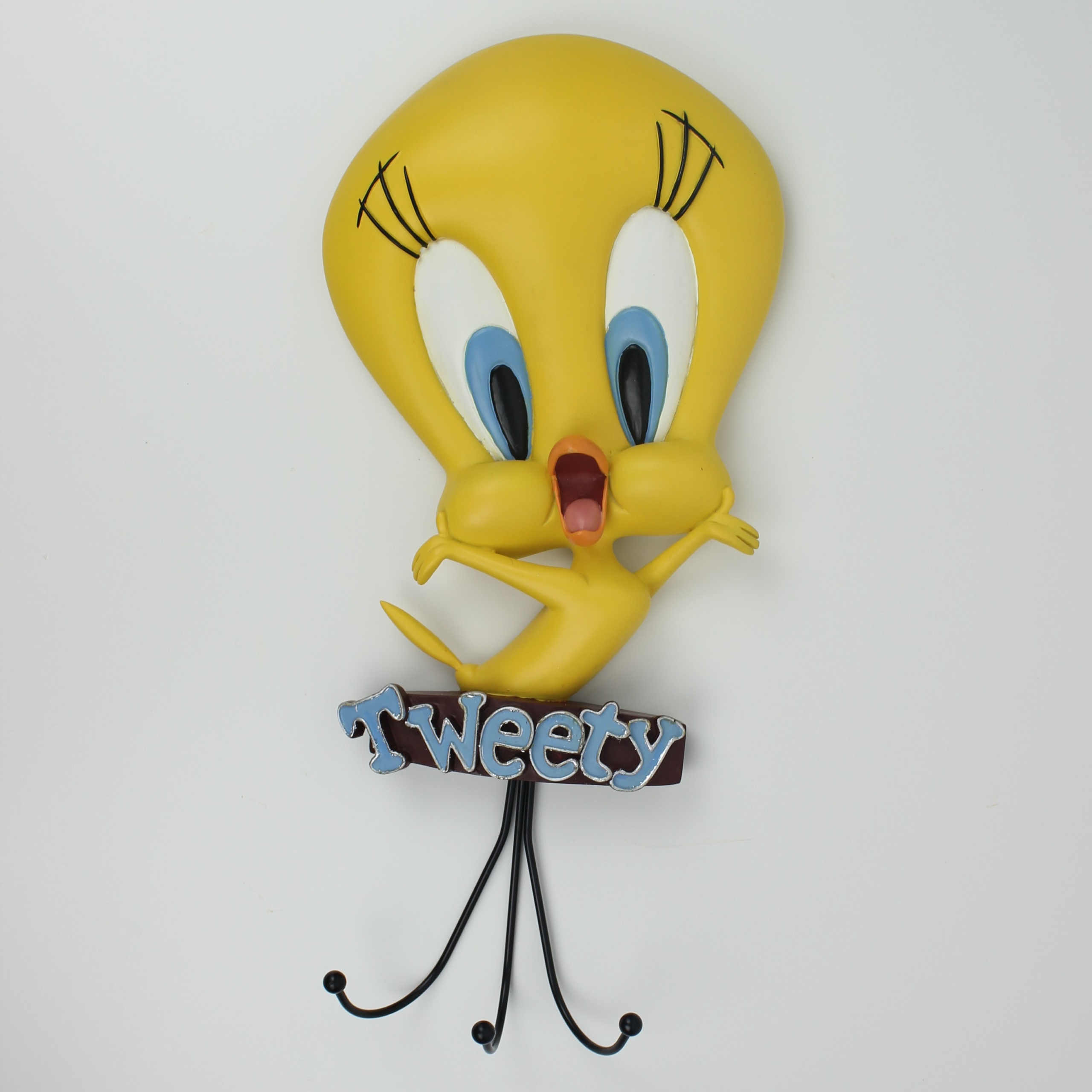 This coat rack from Tasmanian Devil was sculpted by Peter Mook under Warner Bros.’ license. It was taken in production by Rutten. Dates back to 2000. Crafted from durable resin, it remains in excellent condition. Brighten up your home with this cheerful coat rack featuring a happy Tweety Bird! Perfect for any fan, this functional piece adds a touch of whimsy and classic cartoon charm to your space. Keep your coats organized while enjoying the playful energy of Tweety Bird’s delightful design!