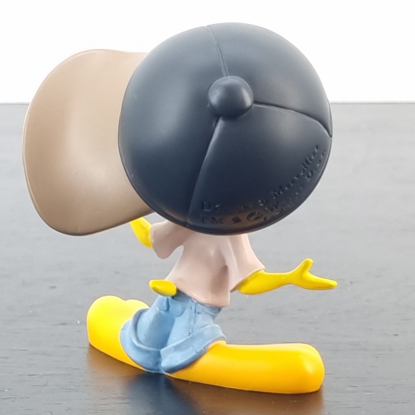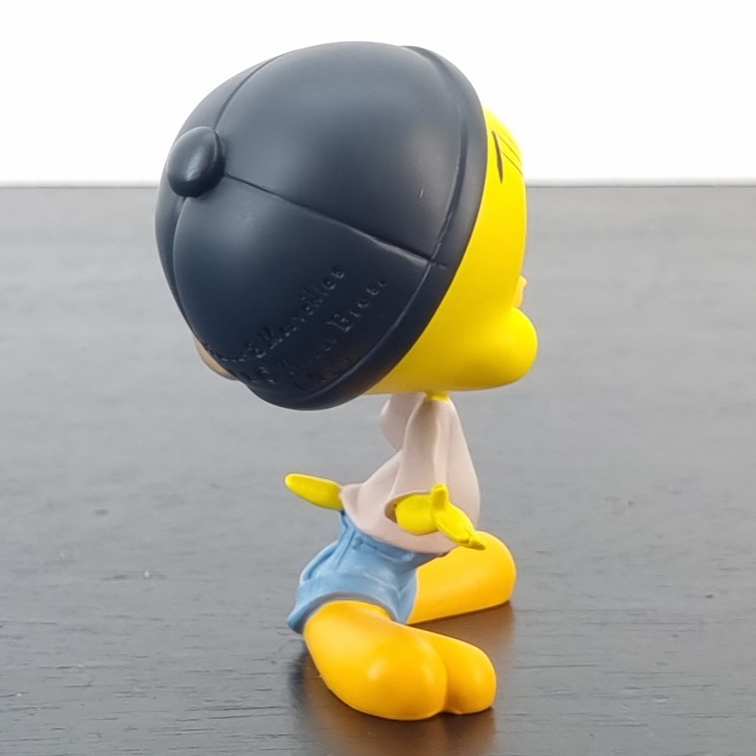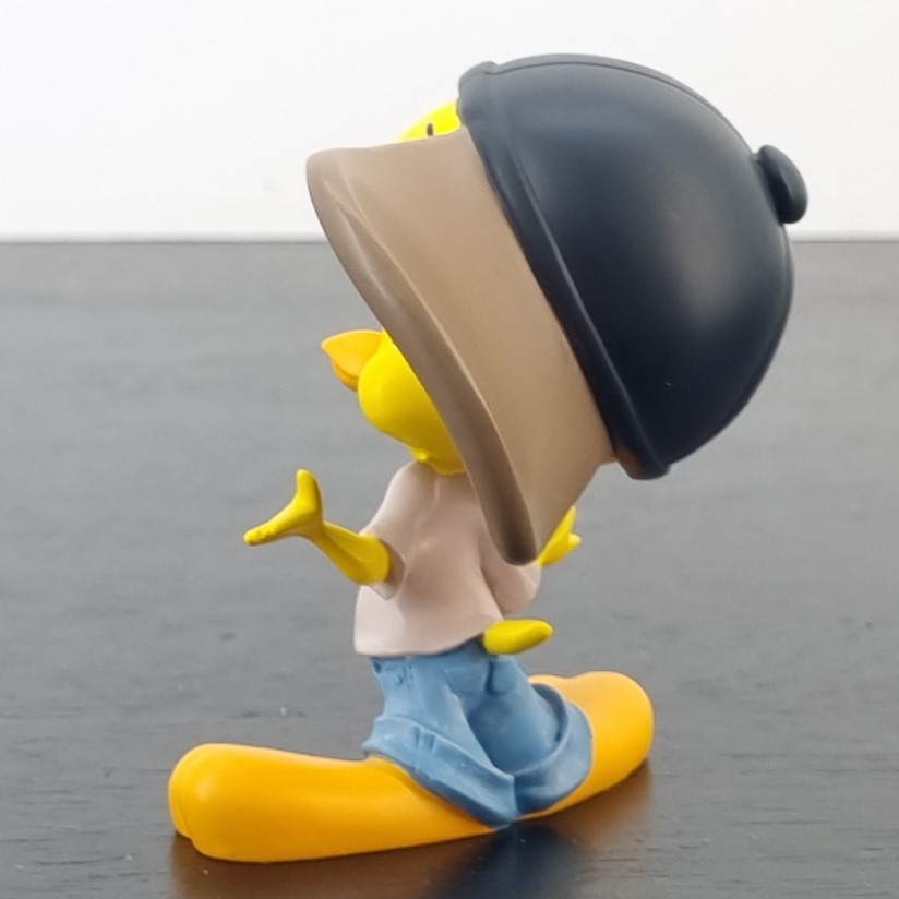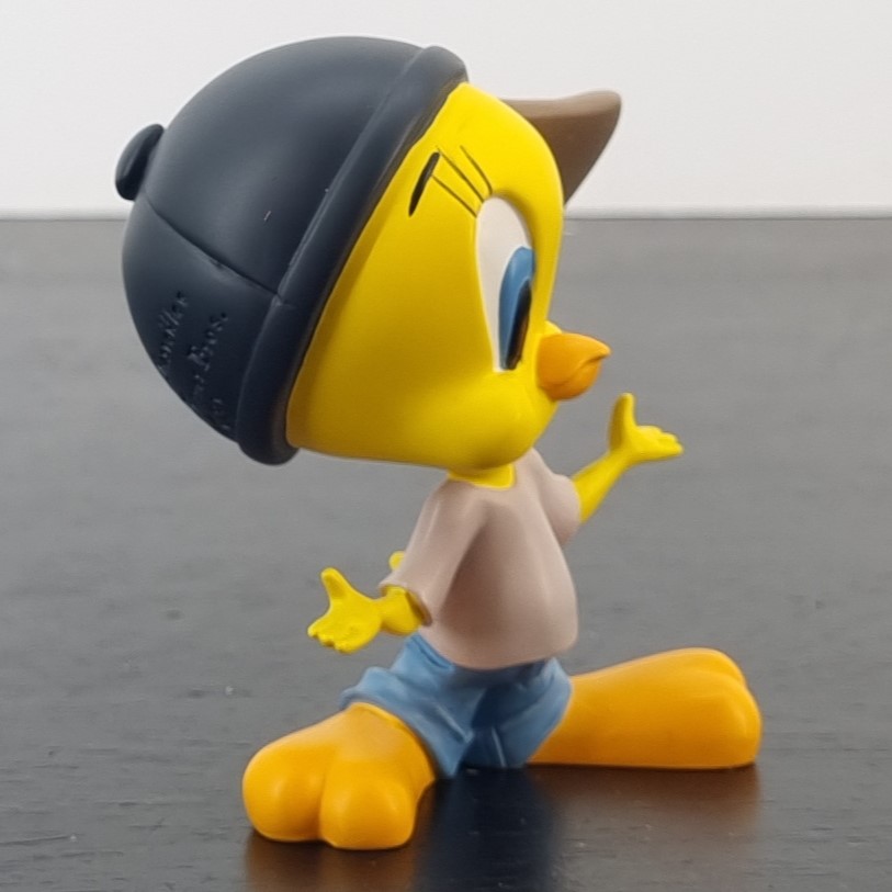 Vintage figurine of Tweety Bird, crafted by Demons and Merveilles under Warner Bros’ license. Dates back to 2003. Crafted from durable resin, it remains in excellent condition. Tweety Bird, sporting a sideways cape, a white shirt, and low jeans, stands with his hands wide open and a baffled look, as if saying, “How would I know?” in the funniest, most clueless way!