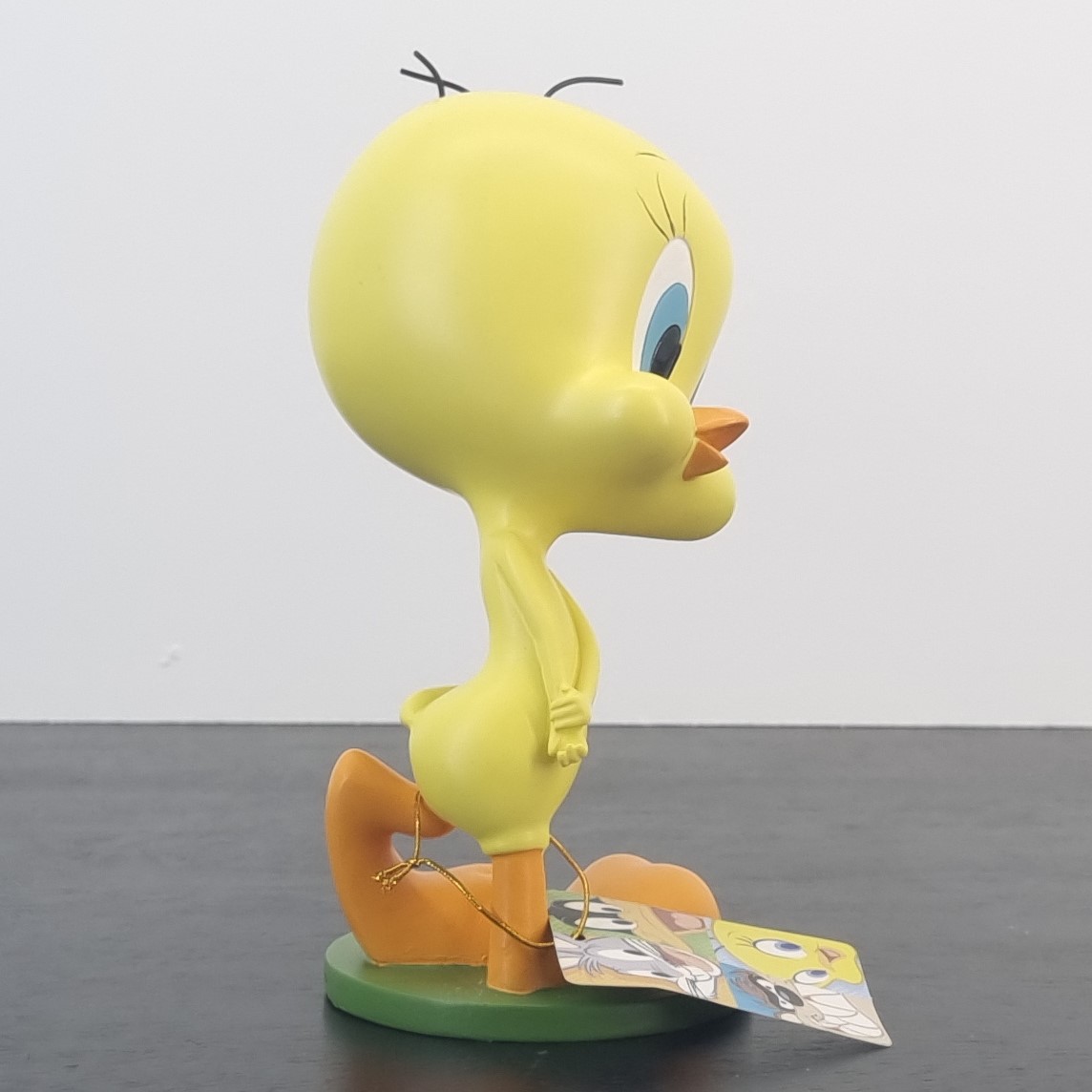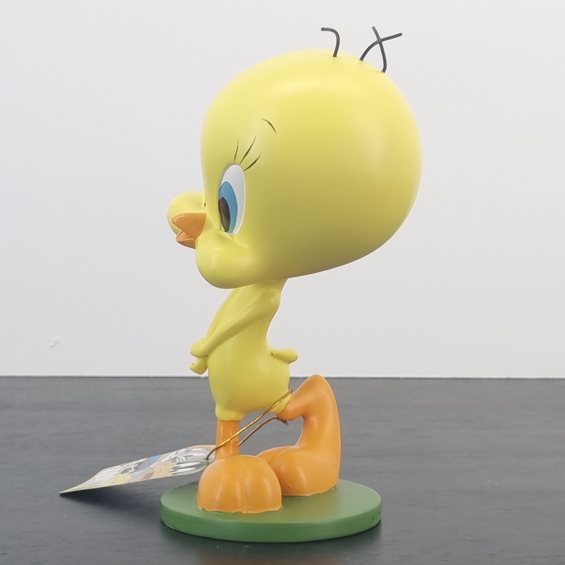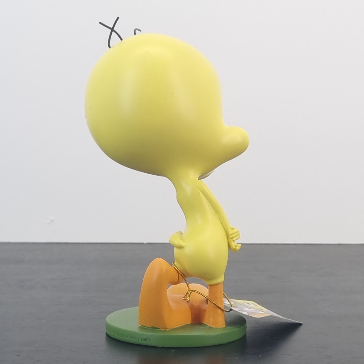 A vintage figurine featuring Tweety Bird, crafted by Paben under Warner Bros.’ license. Dates back to 2003. Made from durable resin, it remains in excellent condition. Bring home a dose of adorable with this charming Tweety Bird figurine! Capturing everyone’s favorite yellow canary in a shy, sweet pose with those signature big blue eyes and innocent expression, this figure is pure Looney Tunes magic. Standing confidently on a green base and crafted with vibrant detail, it’s a nostalgic collectible that will brighten up any shelf.