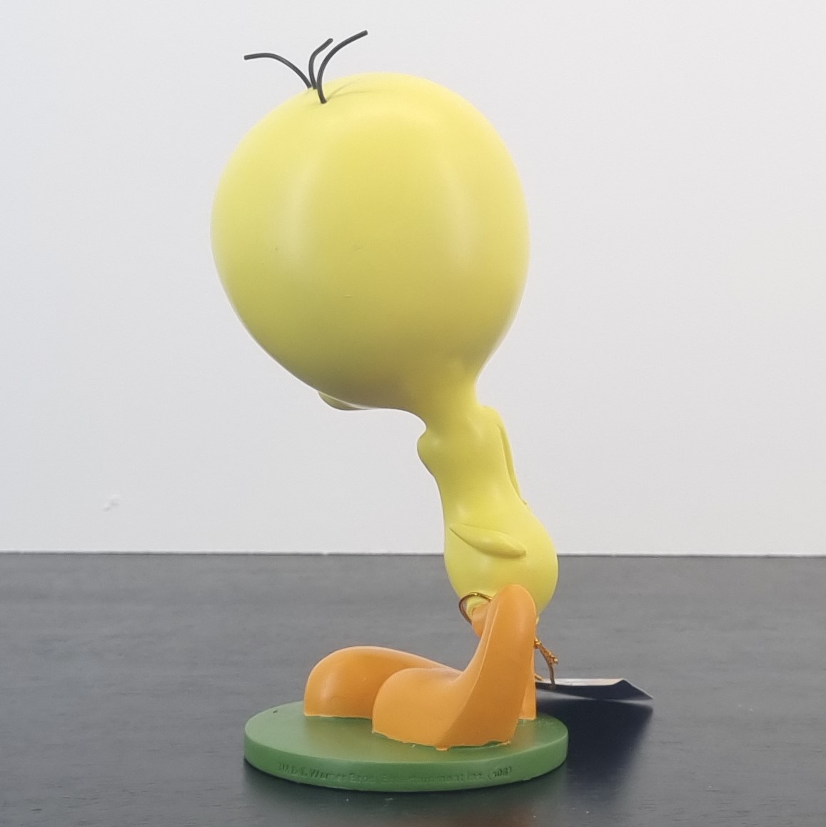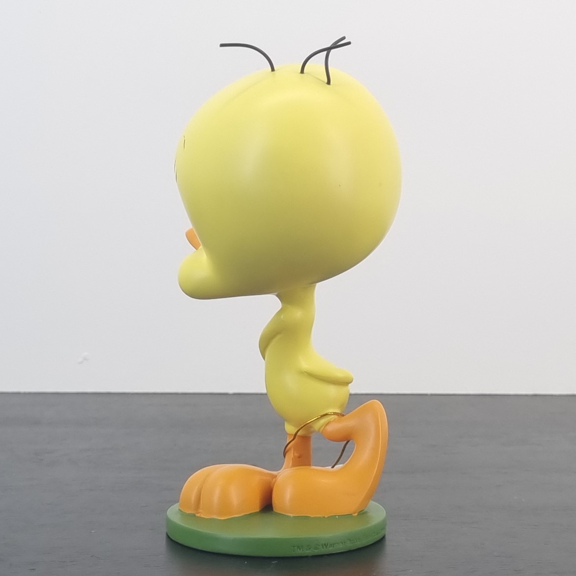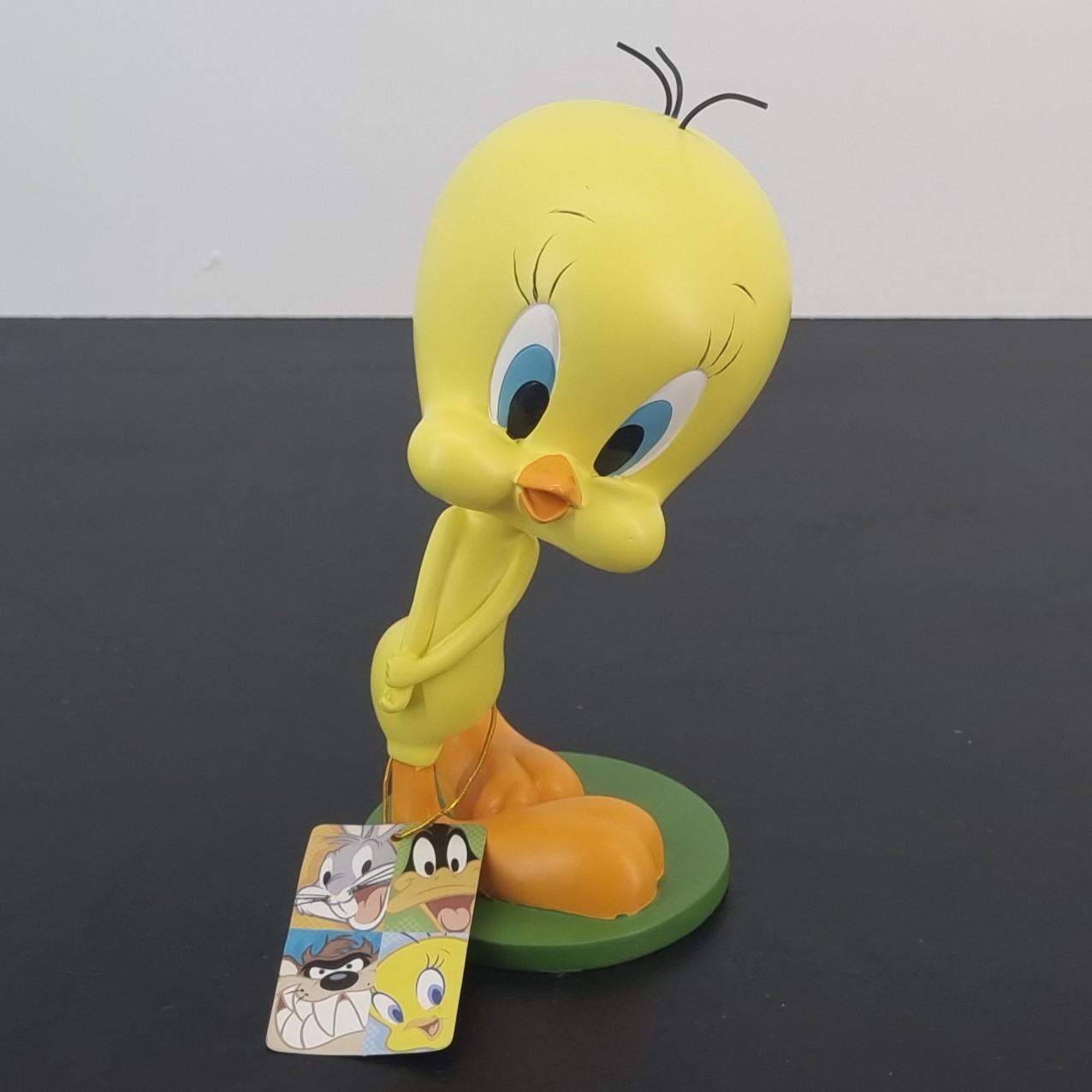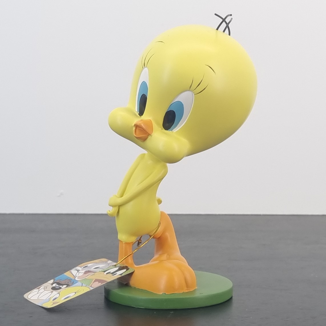 A vintage figurine featuring Tweety Bird, crafted by Paben under Warner Bros.’ license. Dates back to 2003. Made from durable resin, it remains in excellent condition. Bring home a dose of adorable with this charming Tweety Bird figurine! Capturing everyone’s favorite yellow canary in a shy, sweet pose with those signature big blue eyes and innocent expression, this figure is pure Looney Tunes magic. Standing confidently on a green base and crafted with vibrant detail, it’s a nostalgic collectible that will brighten up any shelf.