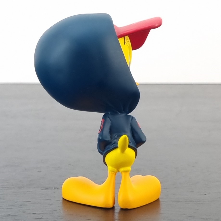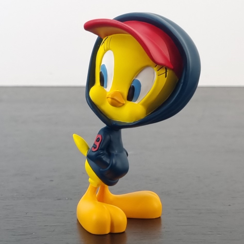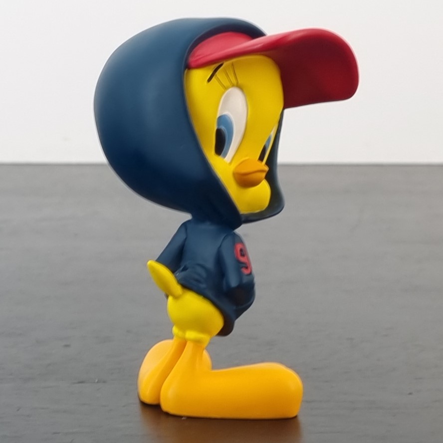 A vintage figurine of Tweety Bird, crafted by Demons and Merveilles under Warner Bros.’ license. Dates back to 2001. Made from durable resin, it remains in excellent condition. Tweety Bird is rocking a cool hoodie with the cap pulled down low, hands casually tucked in his pockets, looking like the cutest little street-smart bird on the block!