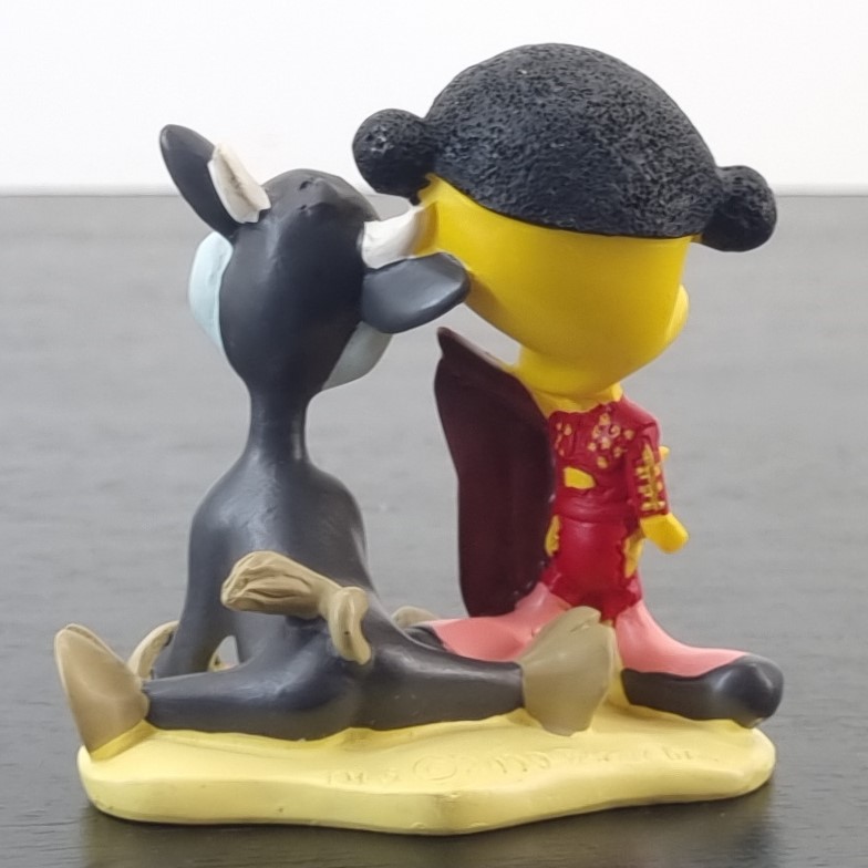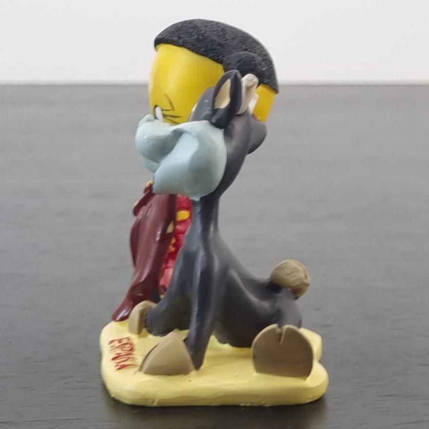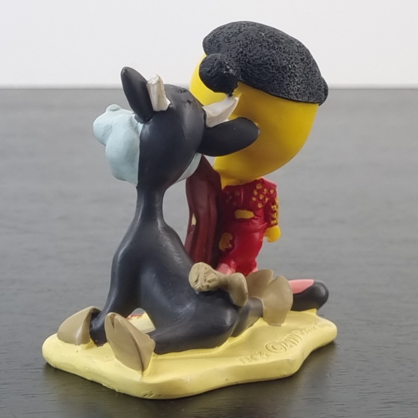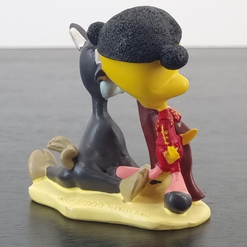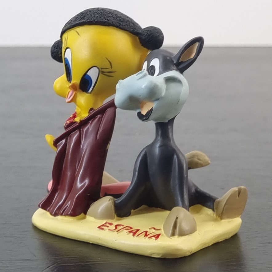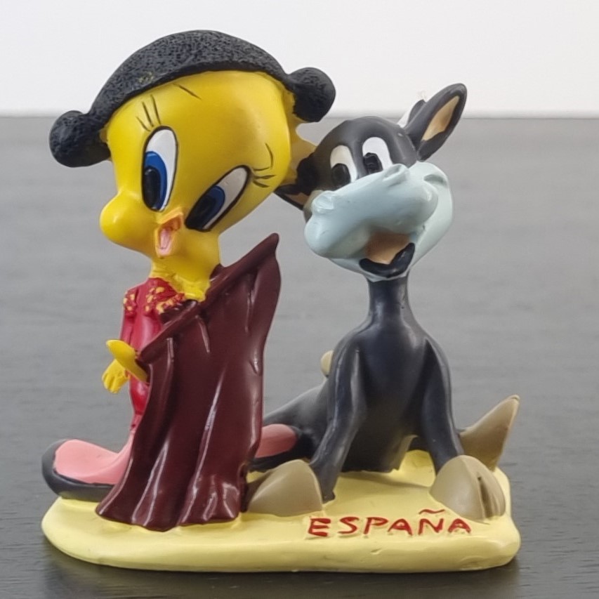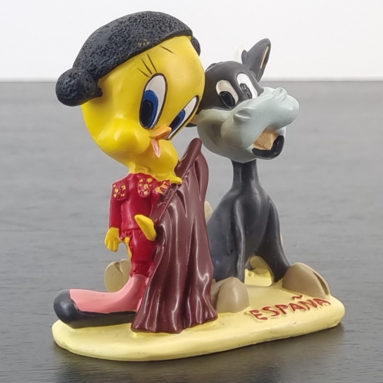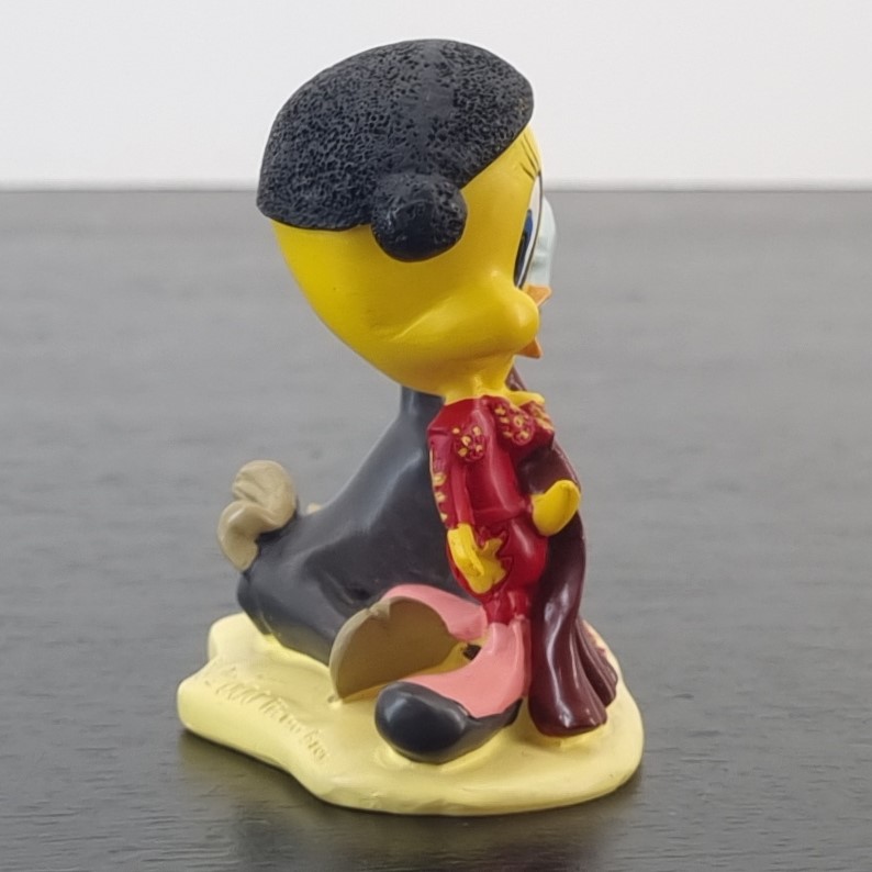 Tweety Bird in Spain. A magnificent figurine showcasing Tweety Bird as a matador with a bull next to Tweety Bird. Travel around the world with a vintage collection of Tweety Bird figurines