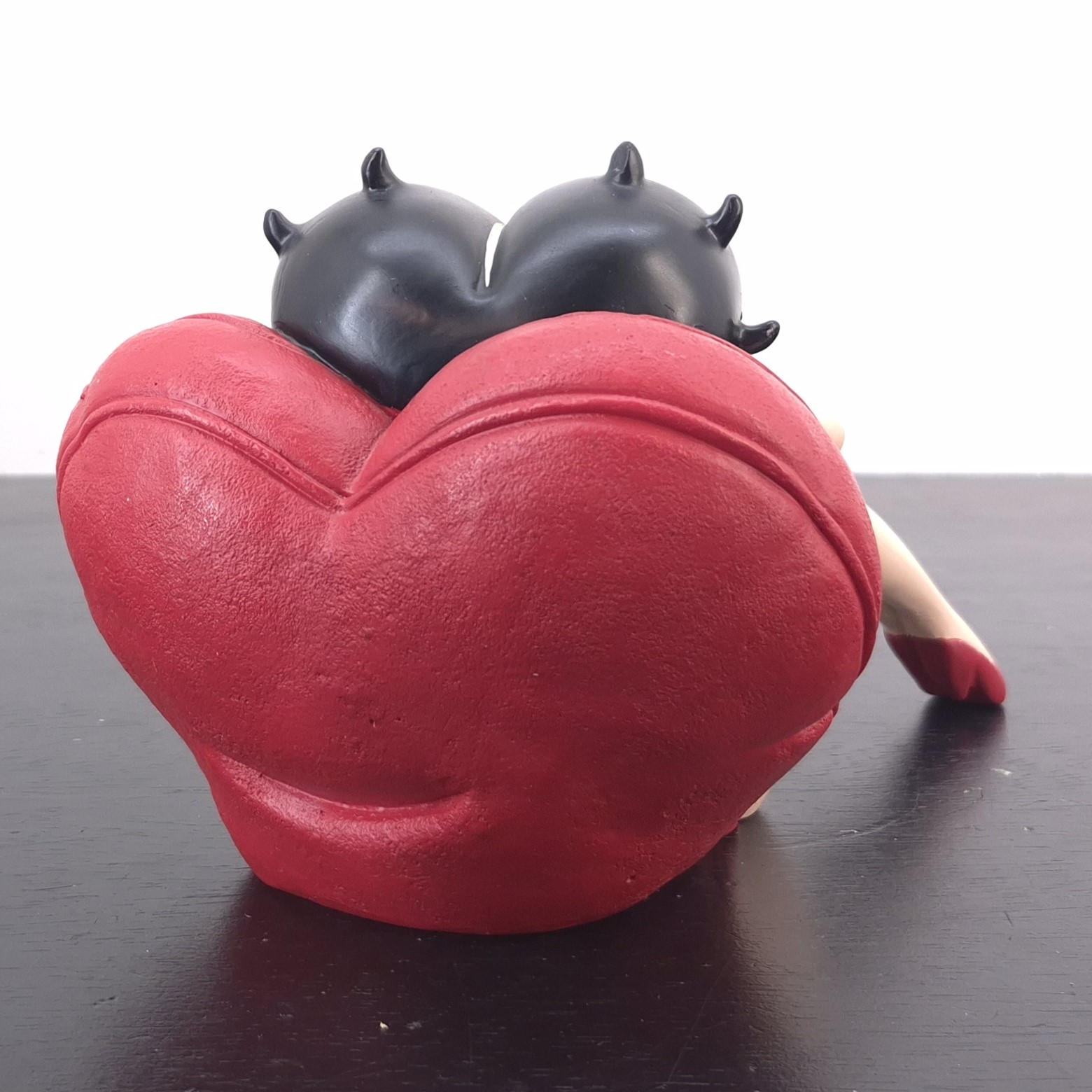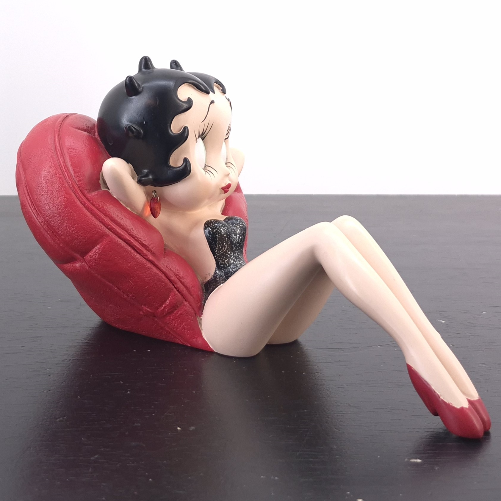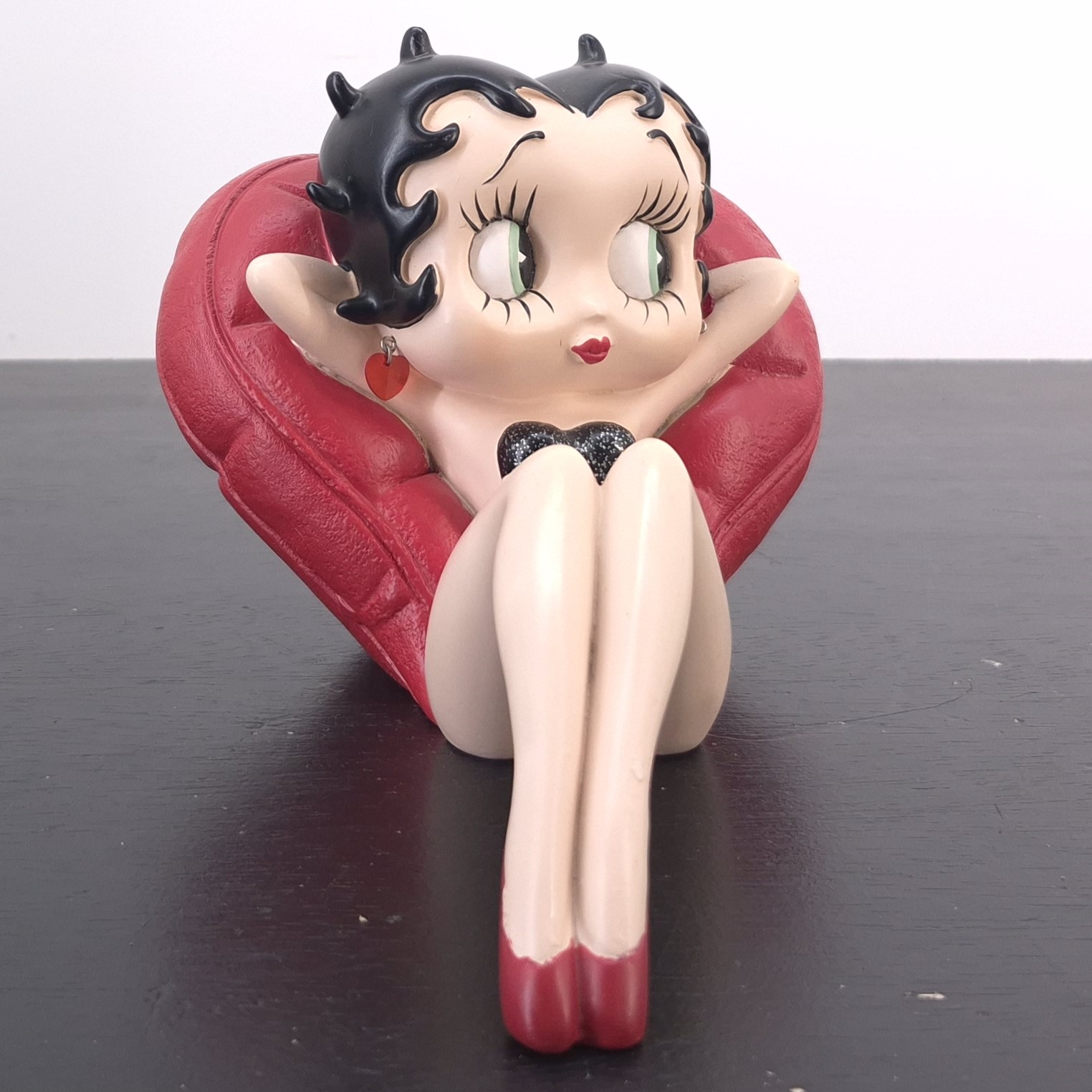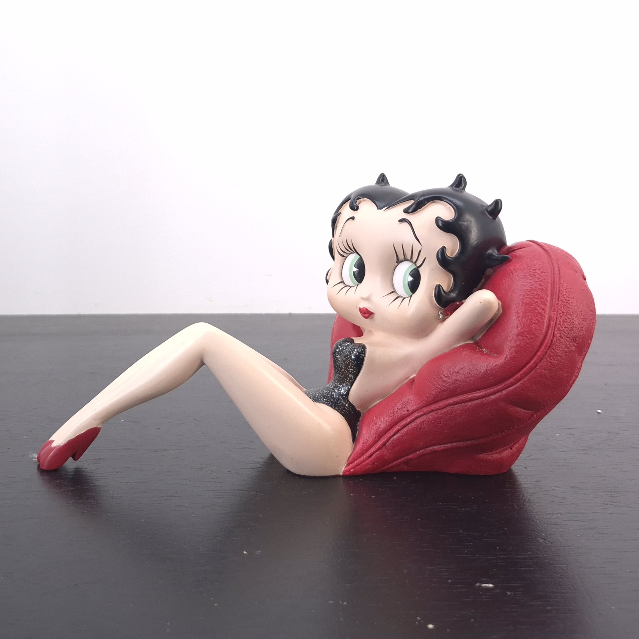 Vintage statue of Betty Boop relaxing against a heart shaped pillow, crafted under ‘s and King Features’ license. Dates back to the 2007. Made from durable resin, it remains in very good condition. Betty Boop is serving pure glamour and sass as she lounges against a heart-shaped pillow, hands behind her head in effortless style. Her black sparkling dress catches the light, while red pumps and heart-shaped earrings add a bold pop of classic charm. This statue captures Betty at her most relaxed—and most irresistible. A must-have for collectors and fans of vintage flair. Let her bring a wink of attitude and elegance to your space.