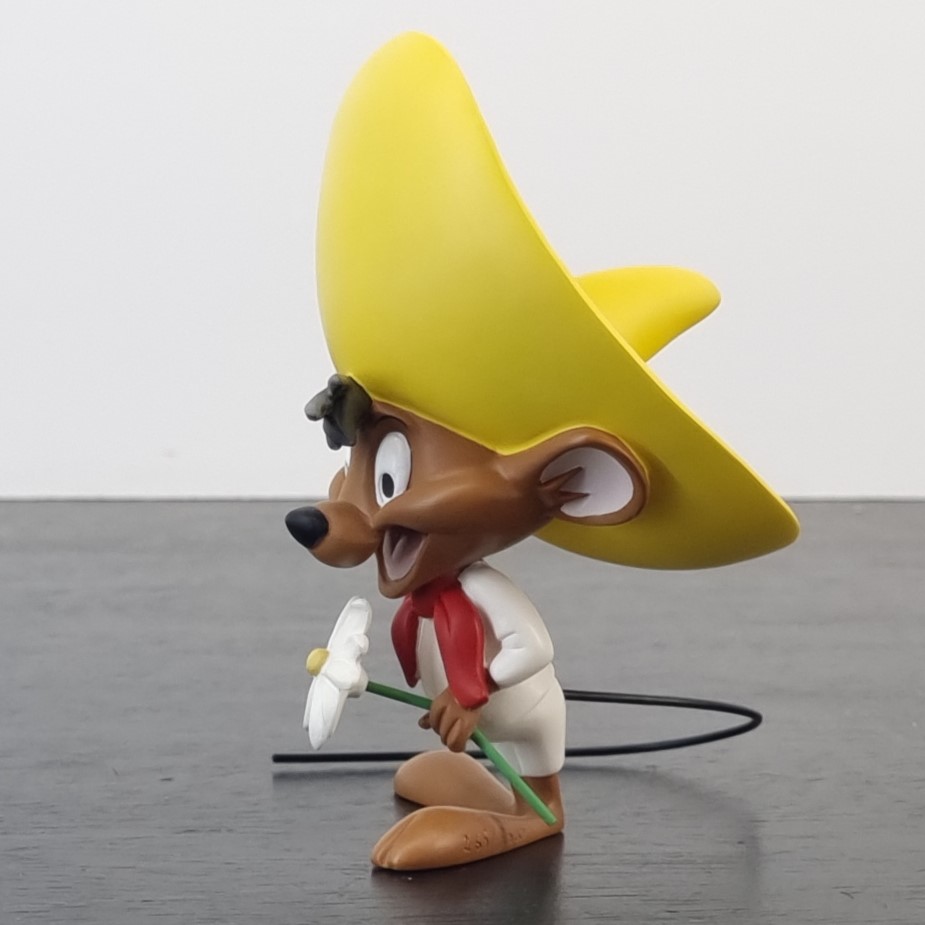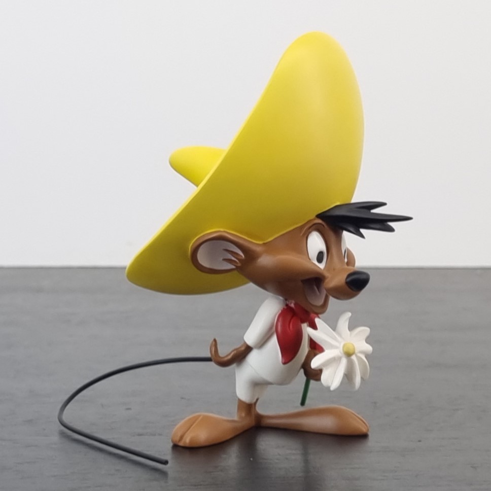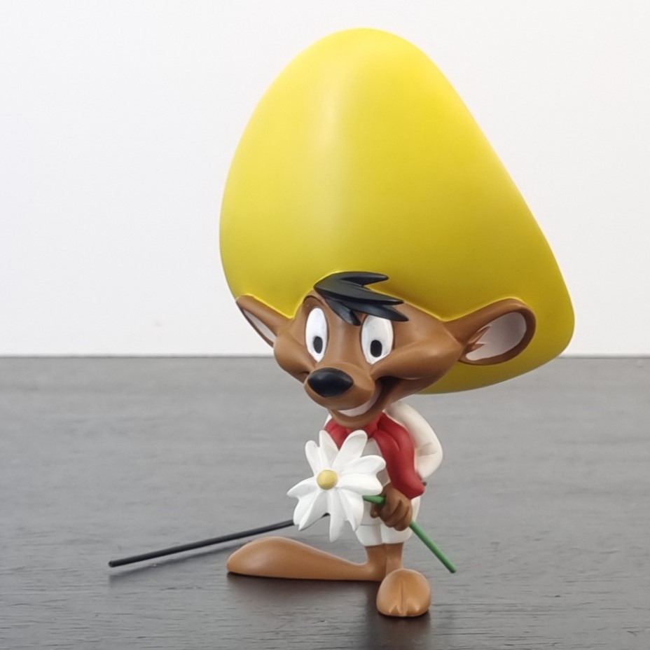 This vintage figurine from Speedy Gonzales was sculpted by Marie Leblon under Warner Bros.’ license. It was taken in production by Leblon-Delienne. Dates back to 1996. Crafted from durable resin, it remains in excellent condition. Bring a touch of sweetness to your collection with this charming Speedy Gonzales figurine by Leblon-Delienne. Known as the fastest mouse in Mexico, Speedy is captured in a rare tender moment, holding a delicate daisy flower in his tiny hands. His oversized sombrero, bright colors, and cheerful stance highlight the playful spirit of this beloved Looney Tunes character. The sculpt balances humor with innocence, making it both heartwarming and fun. Perfect as a display piece on its own or alongside other Looney Tunes favorites, it radiates joy and nostalgia. A must-have collectible for fans of Speedy Gonzales and classic cartoon artistry.