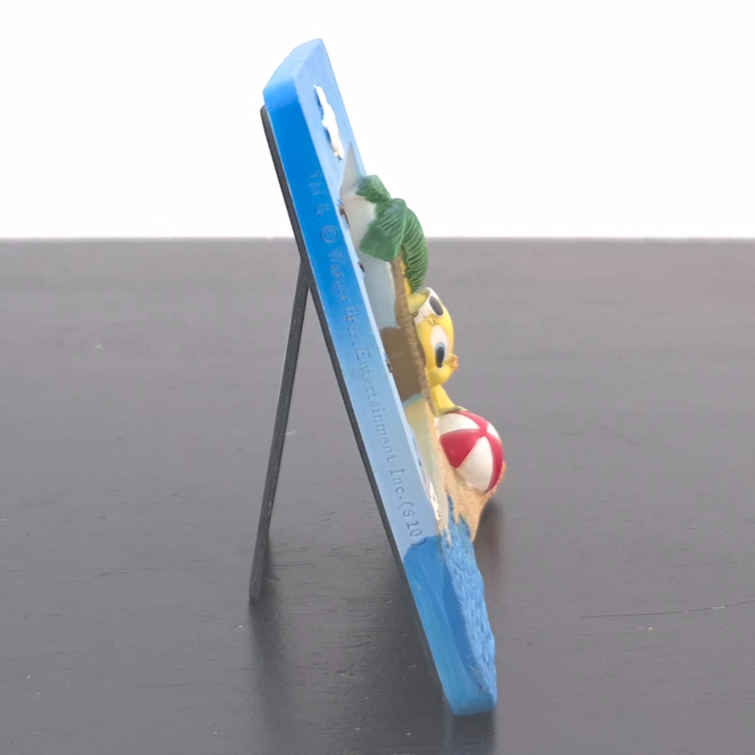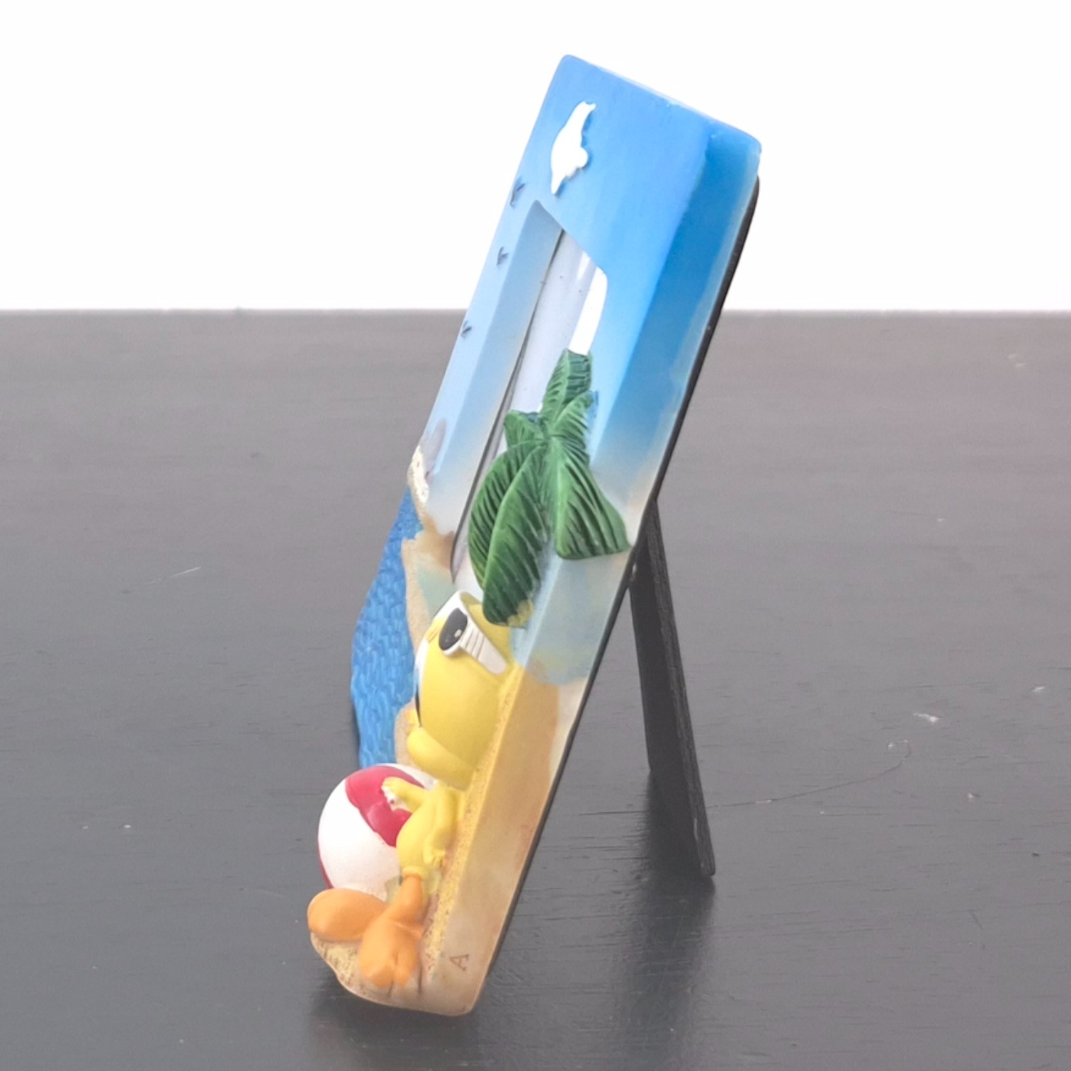 Vintage picture frame of Tweety Bird, crafted by Paben under Warner Bros.’ license. Dates back to 2010. Crafted from durable resin, it remains in excellent condition. This cheerful Tweety Bird photo frame captures a sunny beach scene, bringing a relaxed summer vibe to any space. Set against a bright blue sky and ocean backdrop, Tweety lounges under a palm tree with a beach ball at his feet, adding playful character and charm. The sculpted details, from the textured sand to the gentle waves and flying birds, create a lively and decorative display. Designed to hold a favorite photo, it works perfectly on a shelf, desk, or dresser.
