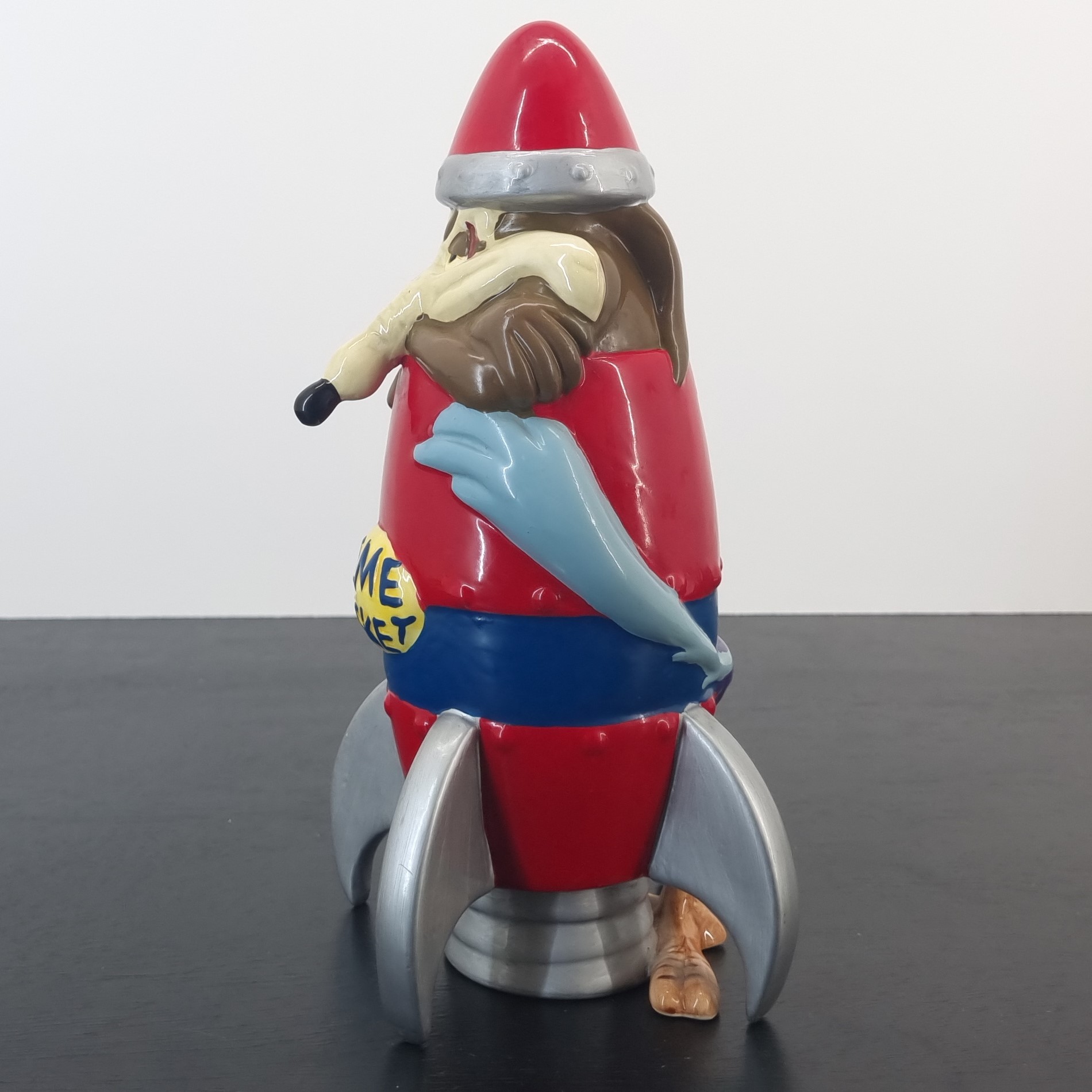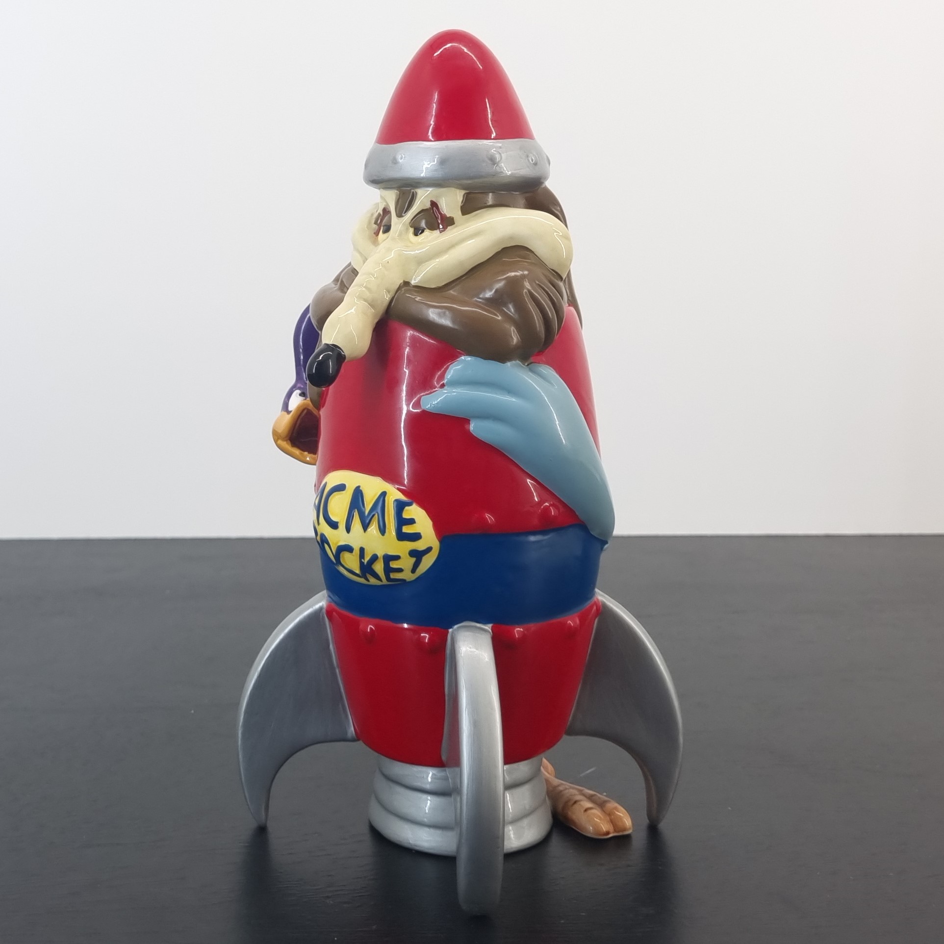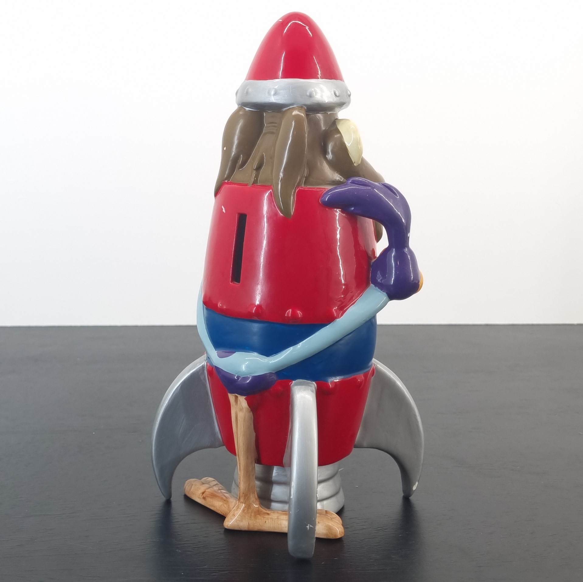 Wile E. Coyote as a ACME rocket with Road Runner wrapped around the rocket. A magnificent and rare collectible money box of your favorite Looney Tunes characters.