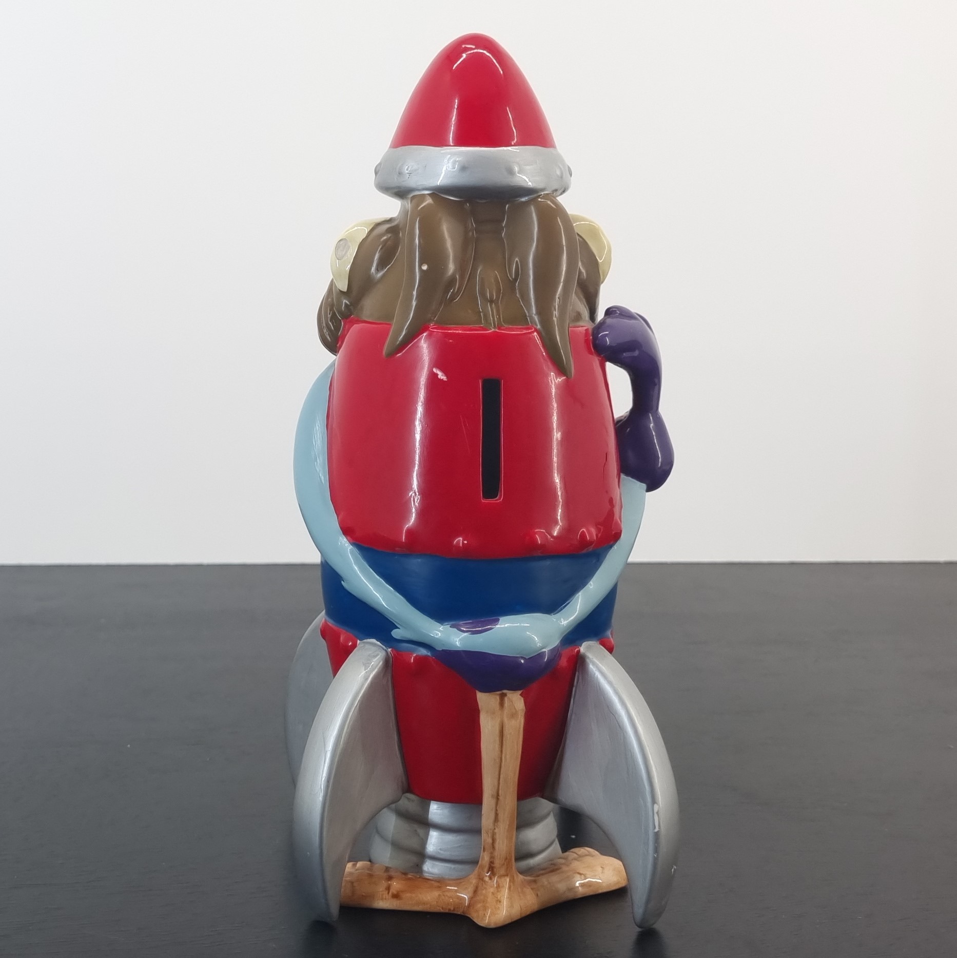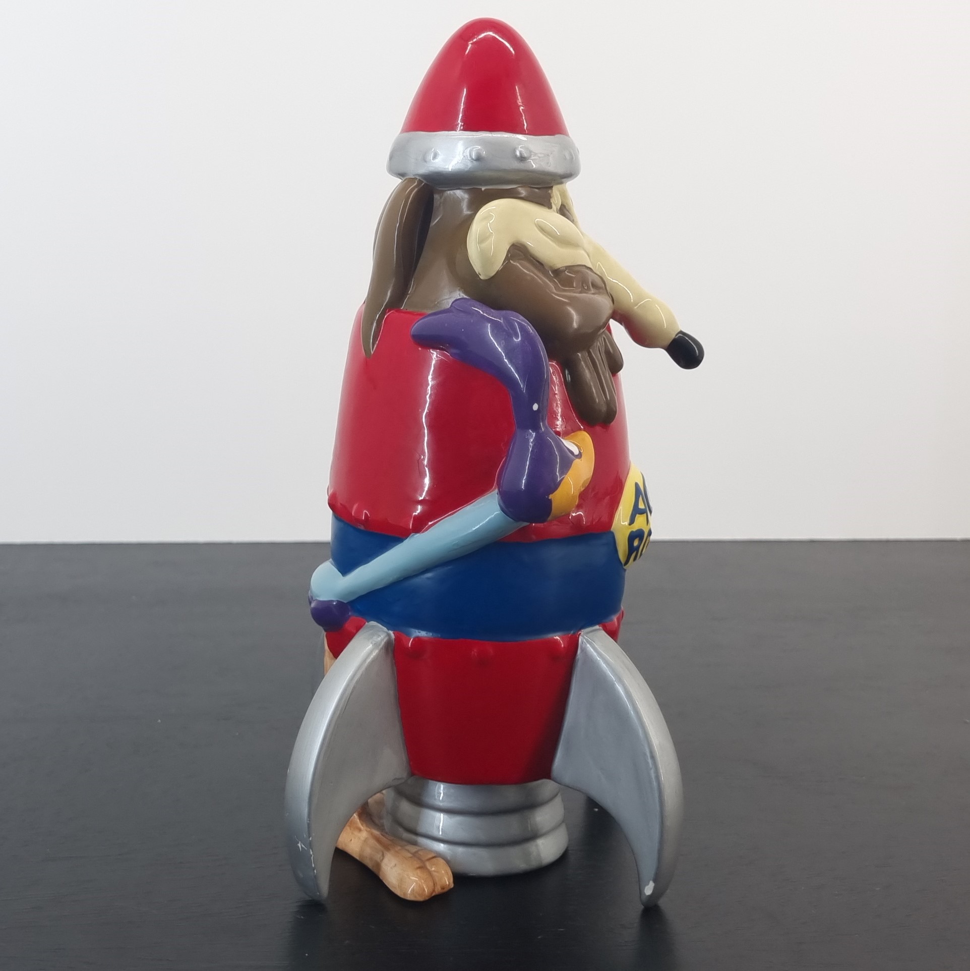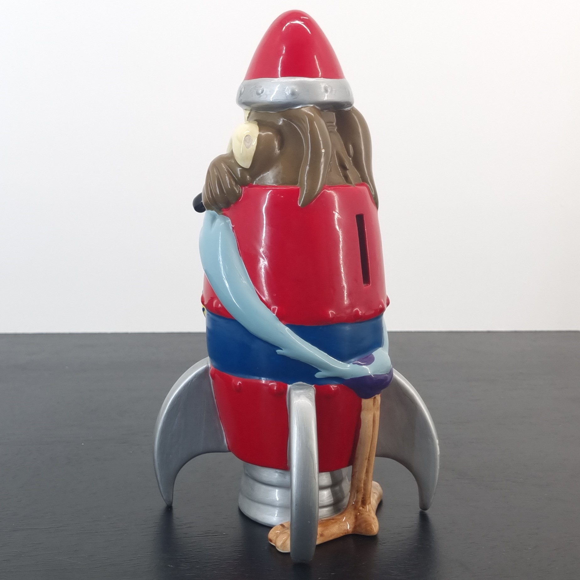 Wile E. Coyote as a ACME rocket with Road Runner wrapped around the rocket. A magnificent and rare collectible money box of your favorite Looney Tunes characters.