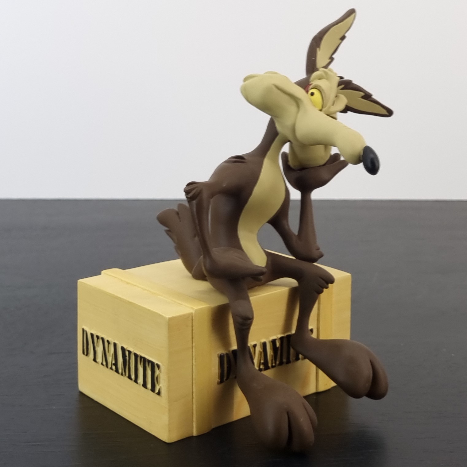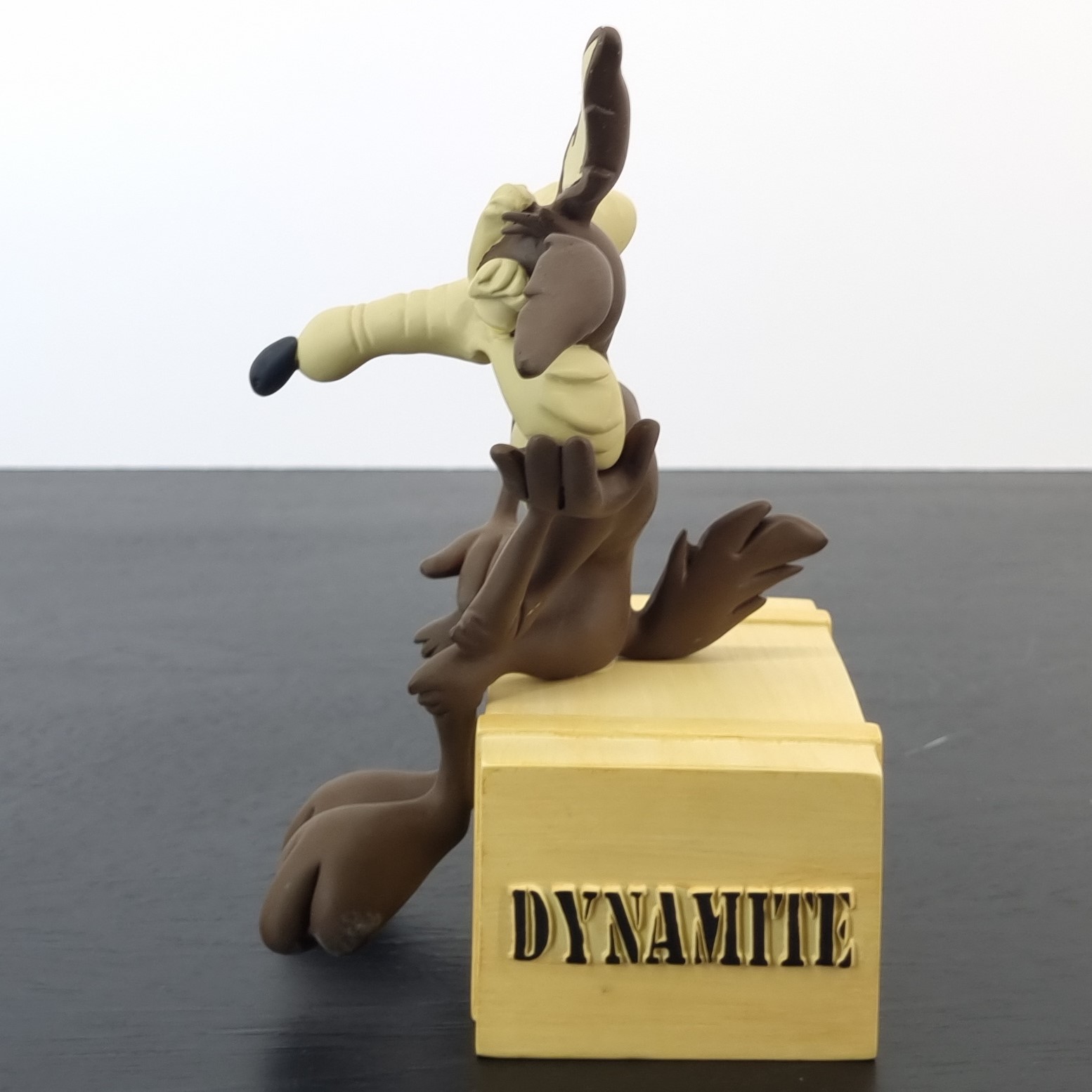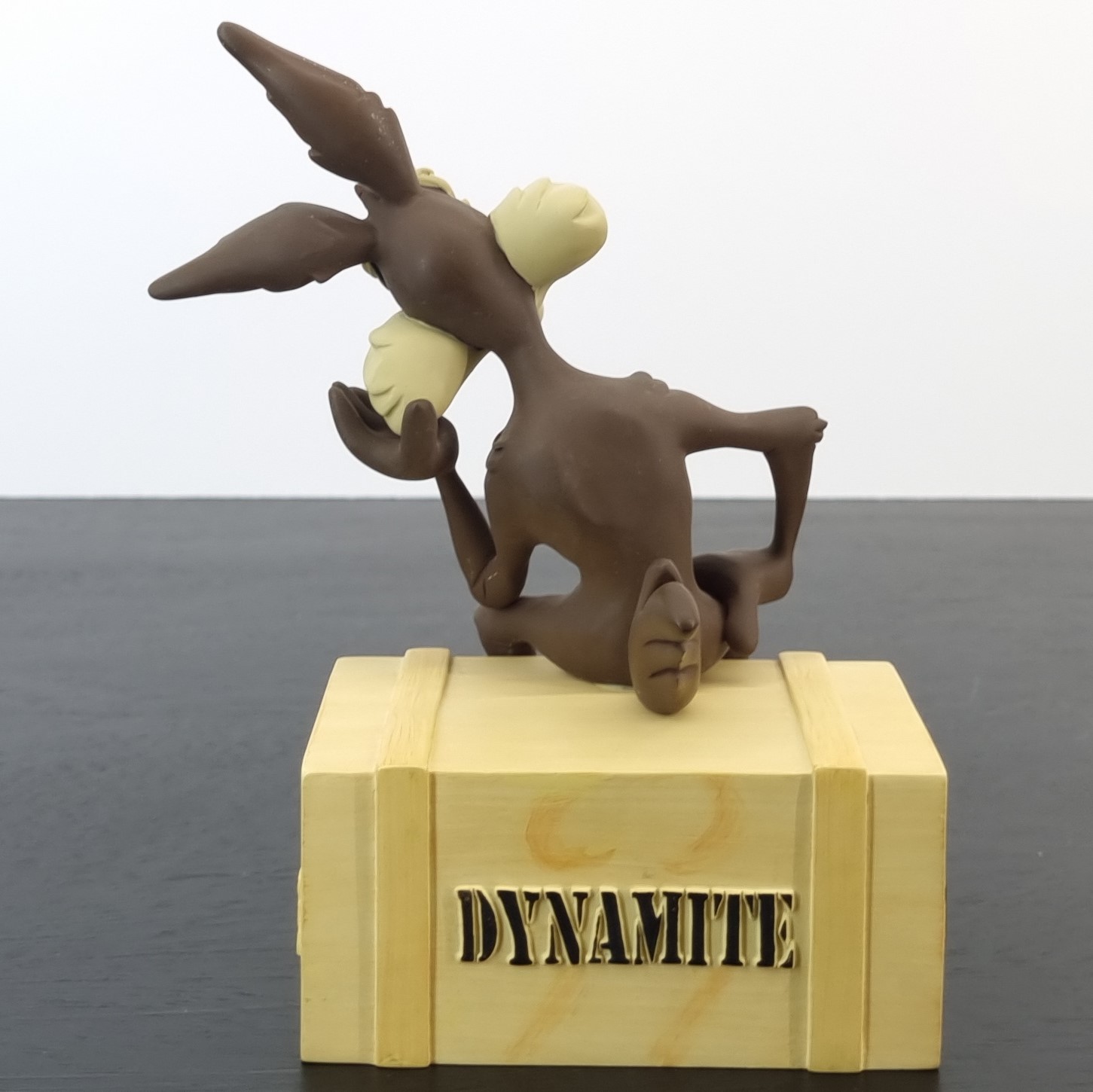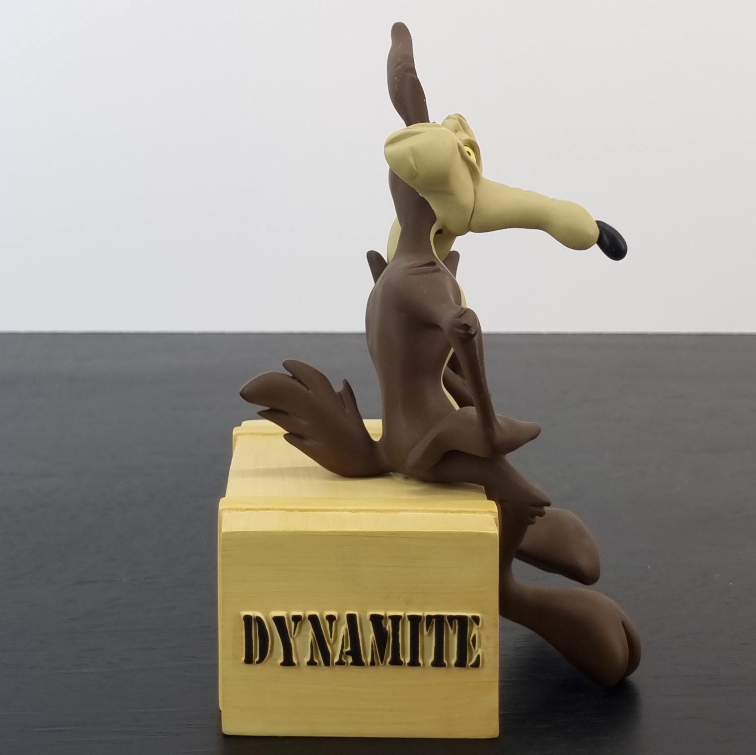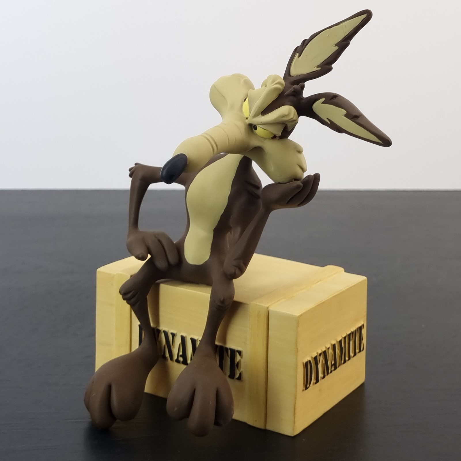Vintage figurine featuring Wile E. Coyote sitting on a crate filled with Dynamite, produced by The David Kracov Gallery.