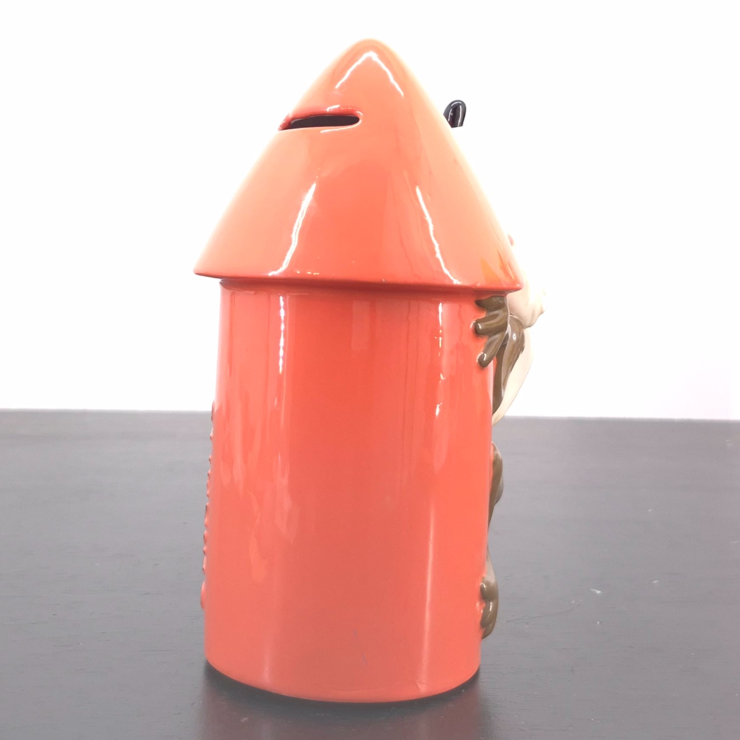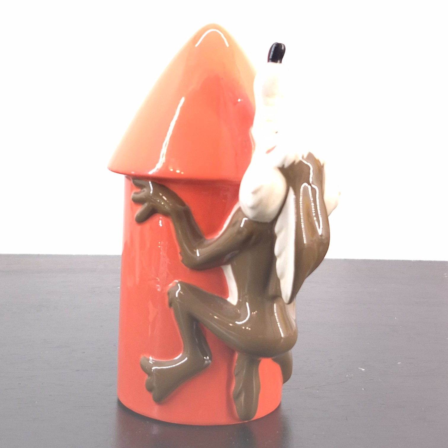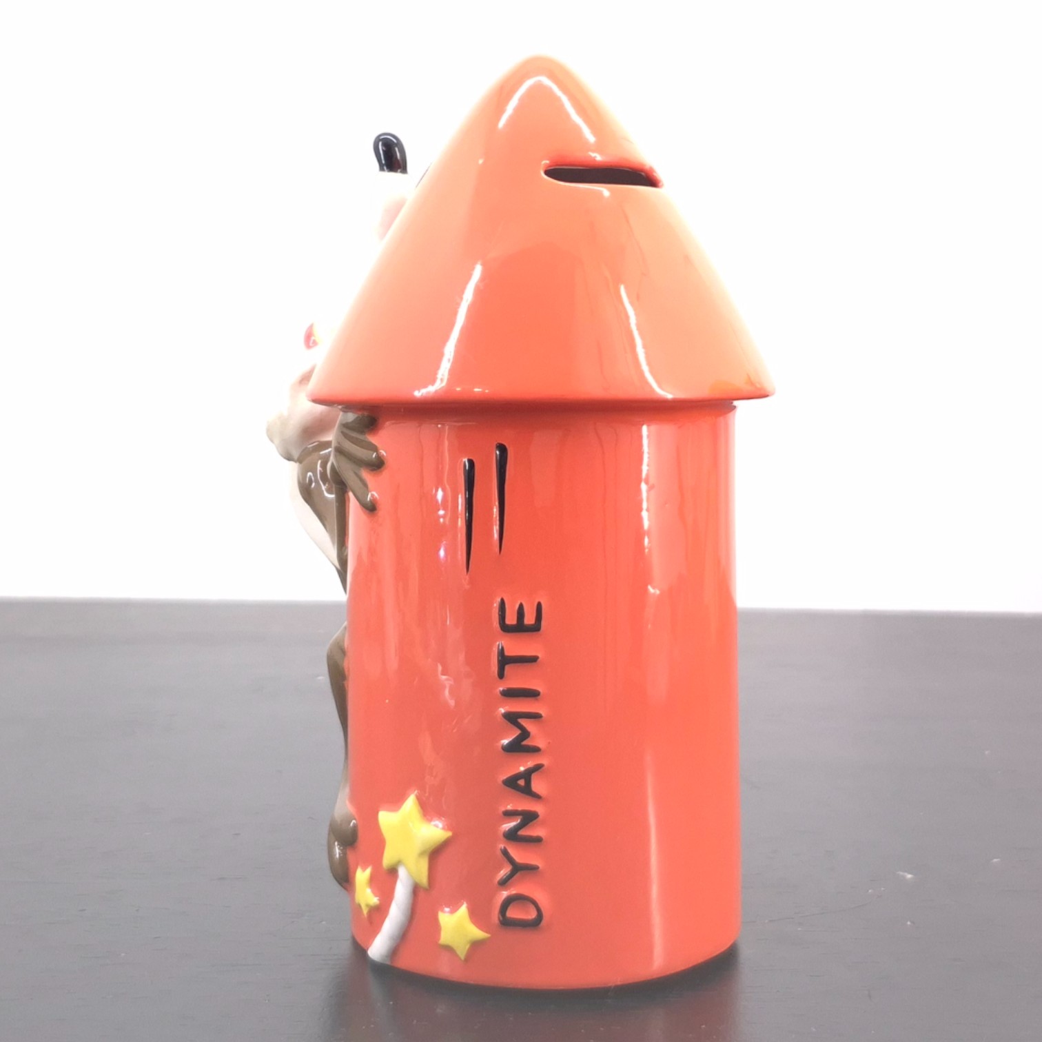 Vintage money box of Wile E. Coyote, crafted by Tropico Diffusion under Warner Bros.’ license. Part of Tropico Diffusion’s Avenue of the Stars collection. Dates back to 1998. Crafted from durable ceramic, it remains in good condition. This playful Wile E. Coyote money box features the iconic character mid-climb on a bright red dynamite-shaped rocket, capturing the humor and energy of the classic Looney Tunes cartoons. The sculpted details and glossy finish highlight Wile E. Coyote’s determined expression and dynamic pose. Decorated with star accents and bold “Dynamite” lettering, the design adds a strong visual impact. Both decorative and functional, it includes a coin slot for everyday use. A charming collectible piece for Looney Tunes fans and vintage cartoon enthusiasts alike.