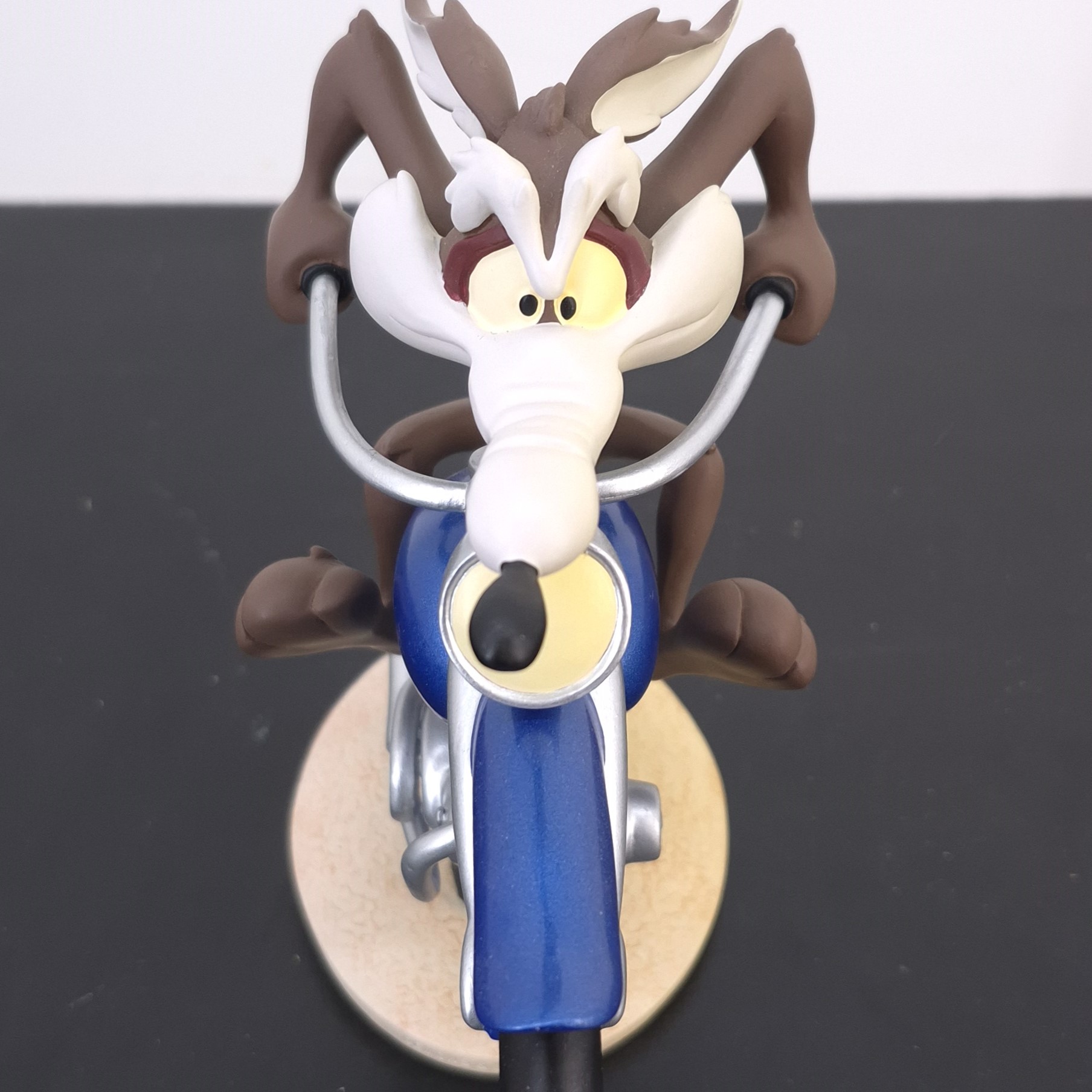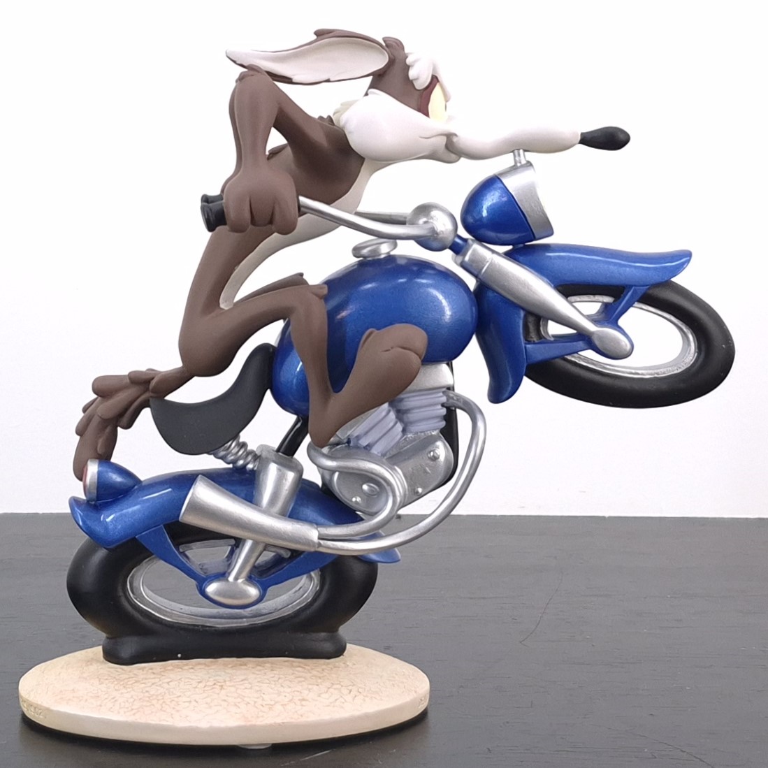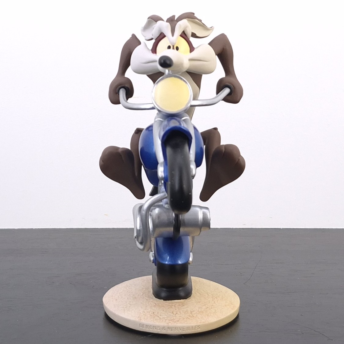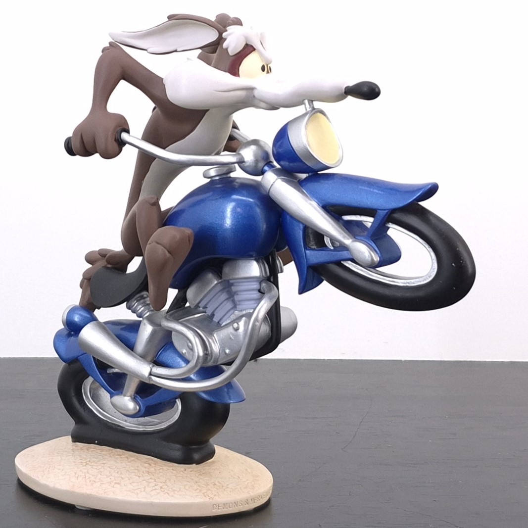 A vintage statue of Wile E. Coyote, crafted by Demons and Merveilles under Warner Bros.’ license. Dates back to 2002. Made from durable resin, it remains in very good condition. Shows some discoloration. Rev up your collection with this exhilarating statue of Wile E. Coyote racing on a sleek blue motorbike! Capturing the thrill of the chase, the front wheel is dramatically lifted in the air, while the back wheel leaves a soft impression on the ground, emphasizing motion and speed. This dynamic piece perfectly conveys Wile E.’s relentless pursuit and adventurous spirit, making it a standout addition for fans of classic cartoons.