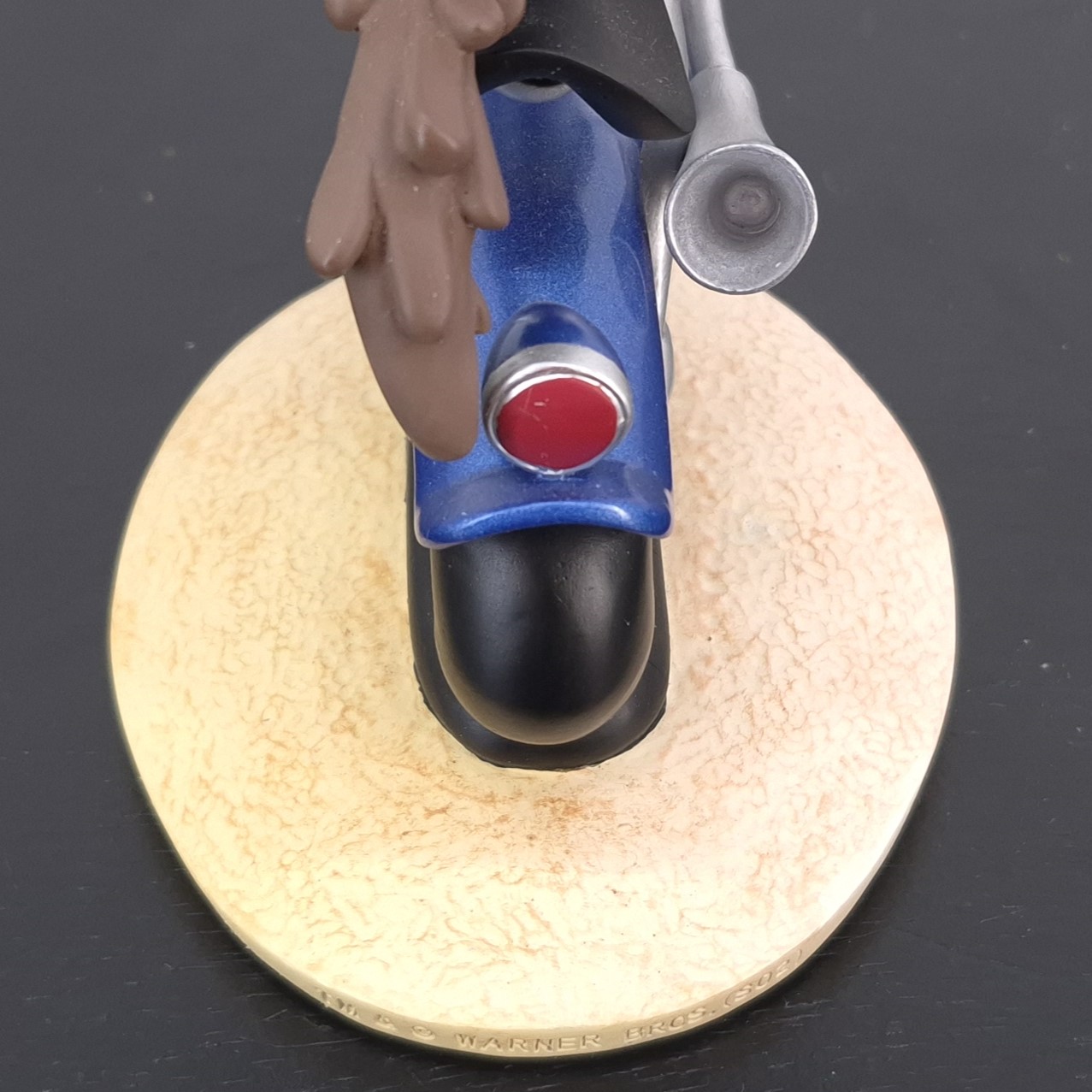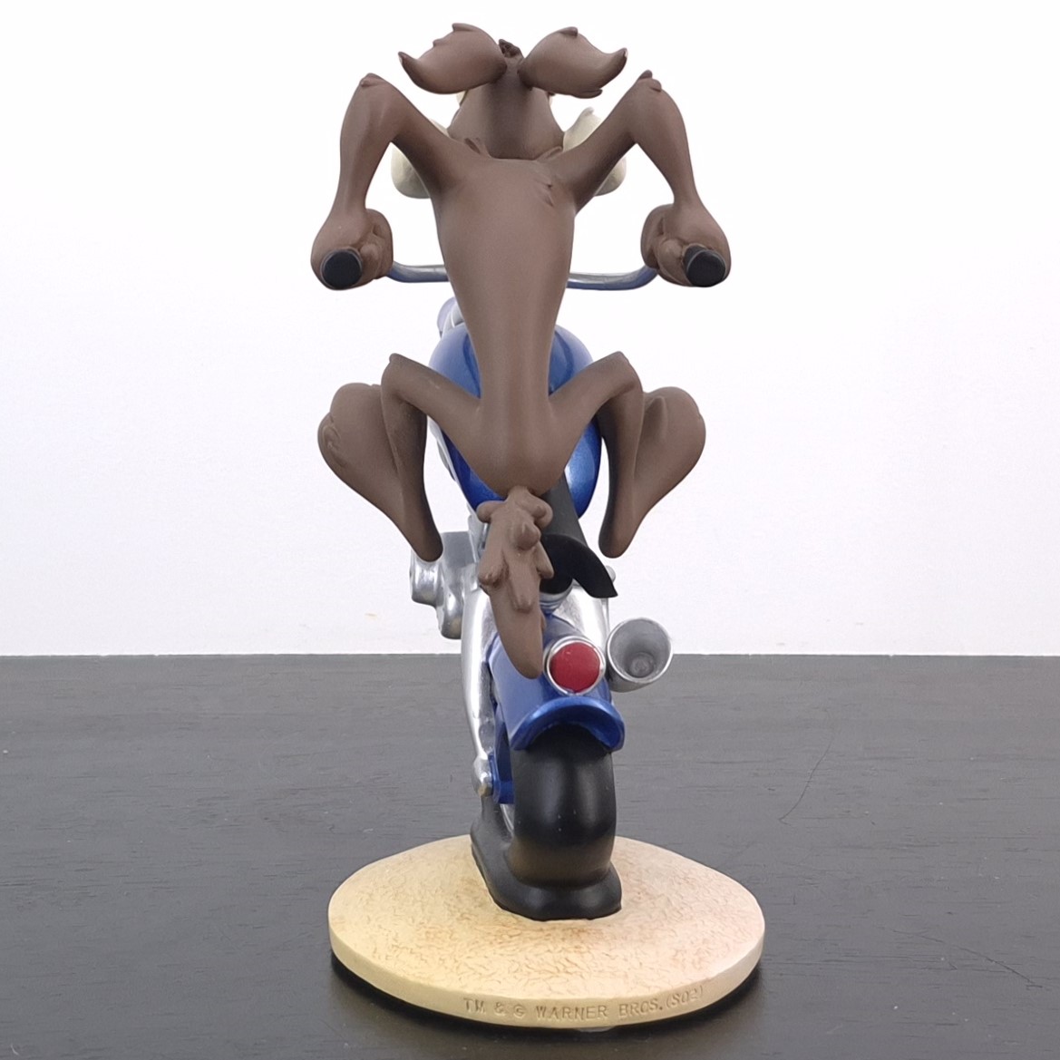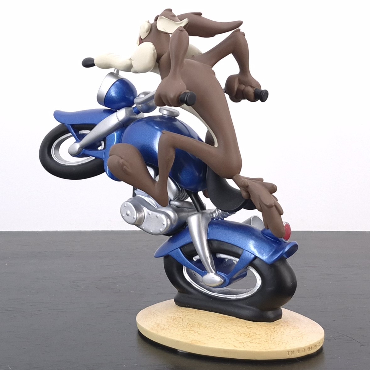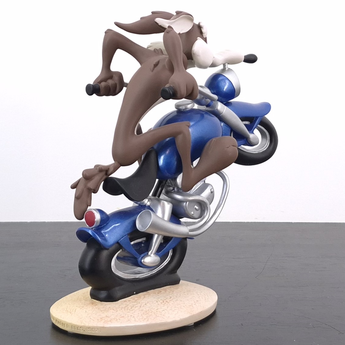 A vintage statue of Wile E. Coyote, crafted by Demons and Merveilles under Warner Bros.’ license. Dates back to 2002. Made from durable resin, it remains in very good condition. Shows some discoloration. Rev up your collection with this exhilarating statue of Wile E. Coyote racing on a sleek blue motorbike! Capturing the thrill of the chase, the front wheel is dramatically lifted in the air, while the back wheel leaves a soft impression on the ground, emphasizing motion and speed. This dynamic piece perfectly conveys Wile E.’s relentless pursuit and adventurous spirit, making it a standout addition for fans of classic cartoons.
