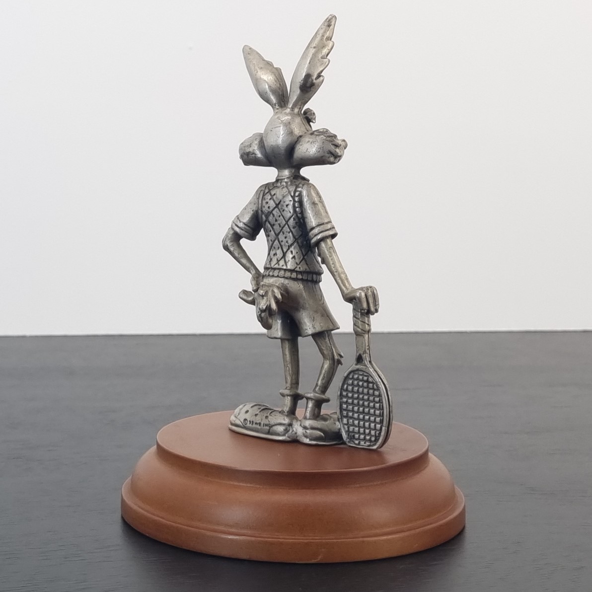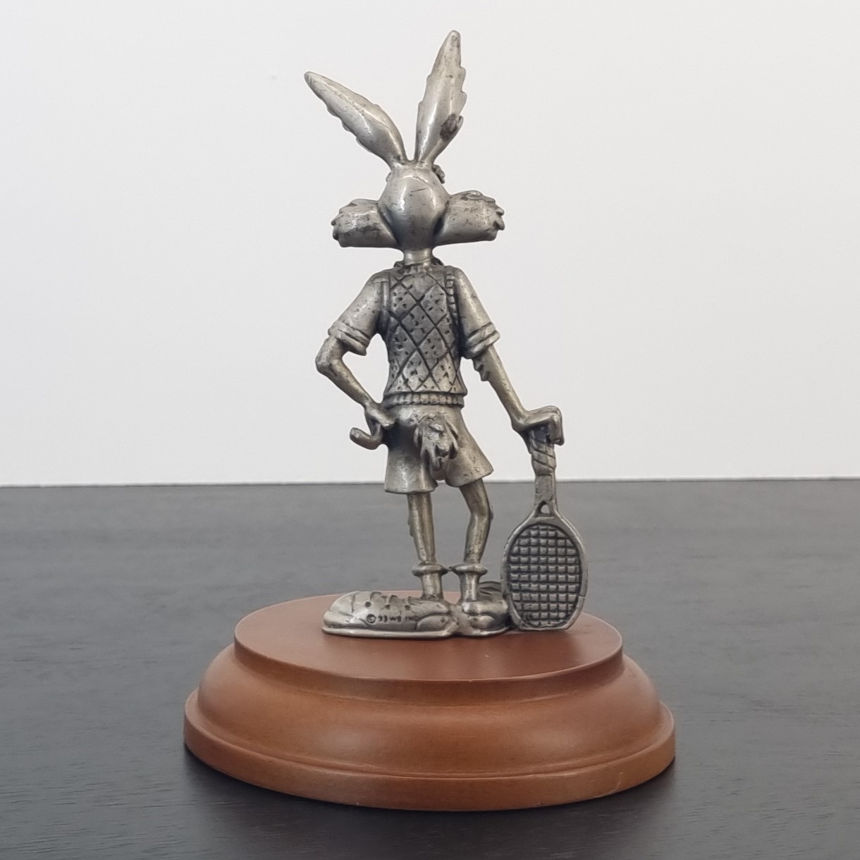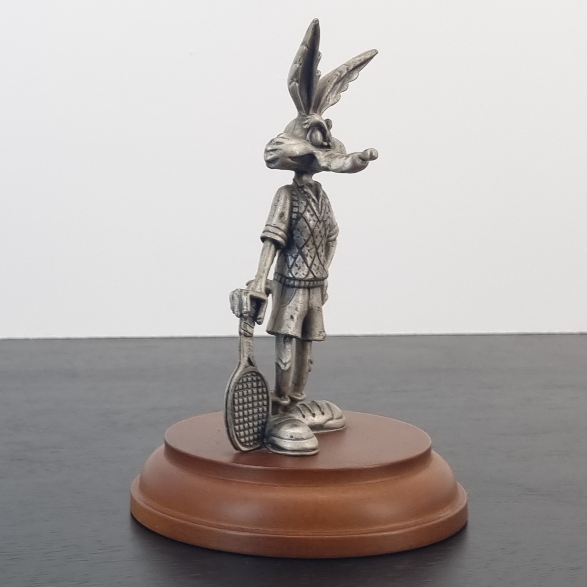 Magnificent pewter statue of Wile E. Coyote playing tennis.