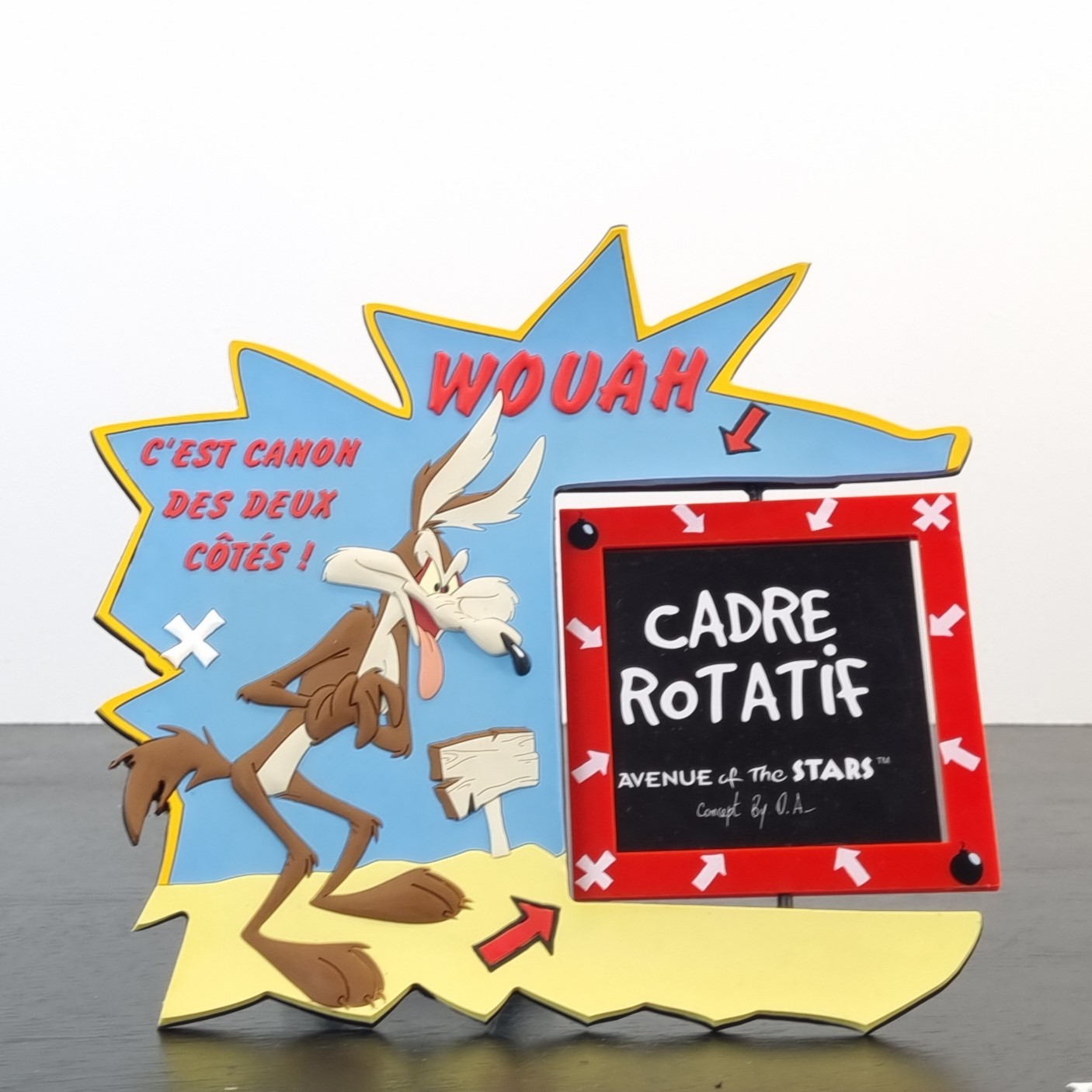 Vintage Wile E. Coyote picture frame. Tropico Diffusion produced this collectible picture frame in license of Warner Bros. It is part of the Avenue of the Stars product line from Tropico Diffusion. This Looney Tunes picture frame is made from high quality PVC. This vintage collectible was produced in the late 1990’s. The picture frame is in excellent condition. This picture frame was distributed in a plastic bag and a cardboard plate, both are present.