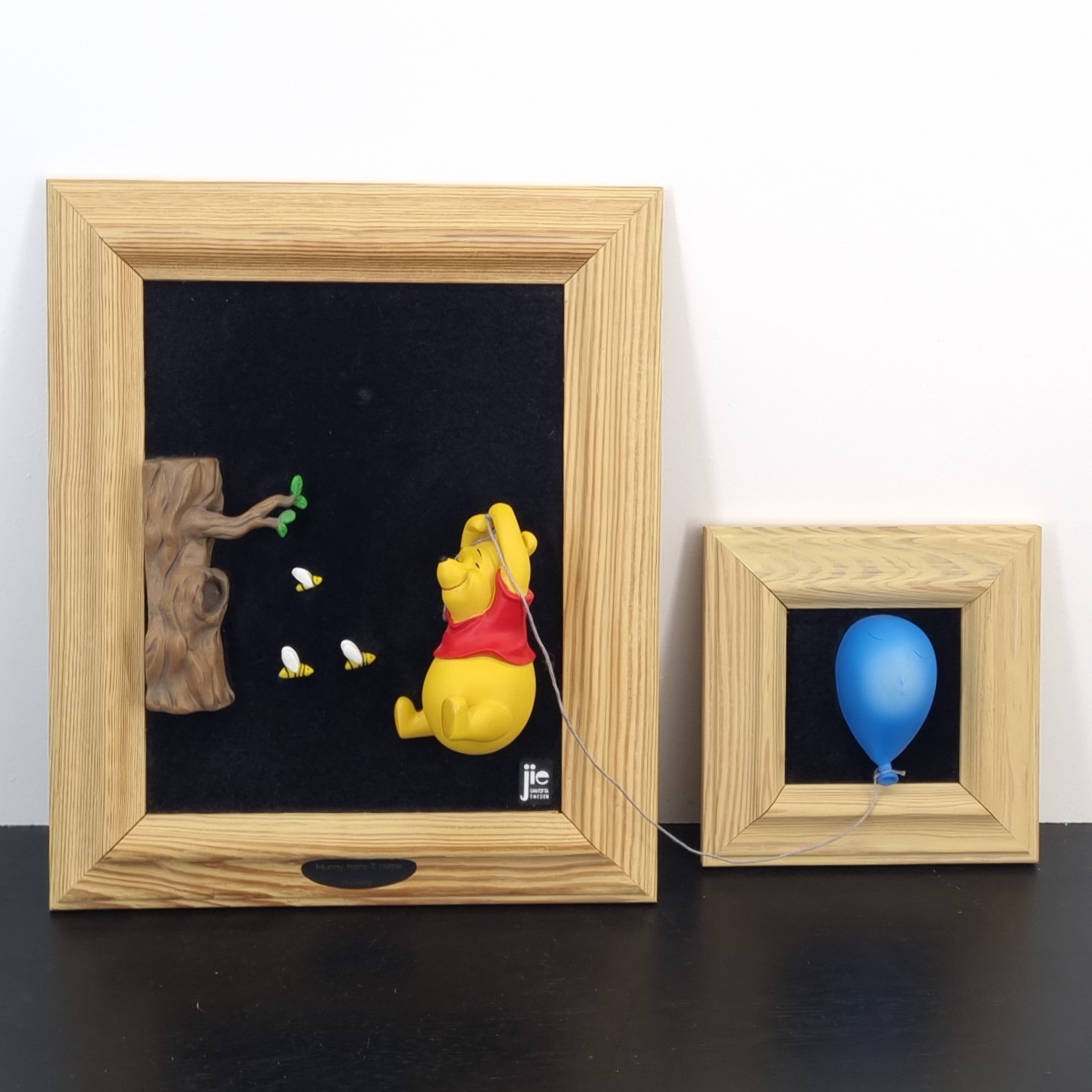 This three-dimensional wall art, featuring the beloved character Winnie the Pooh, is a collectible from Jie Art under license from Walt Disney. Crafted from high-quality resin, it sits against a black cloth background. Additionally, a wooden frame encases it. Joakim Lindstrup designed this piece in the late 1980s to early 1990s. Consequently, this vintage Walt Disney collectible remains in excellent condition. The piece showcases a stunning 3D depiction of Winnie the Pooh is called; Hunny here I come.
