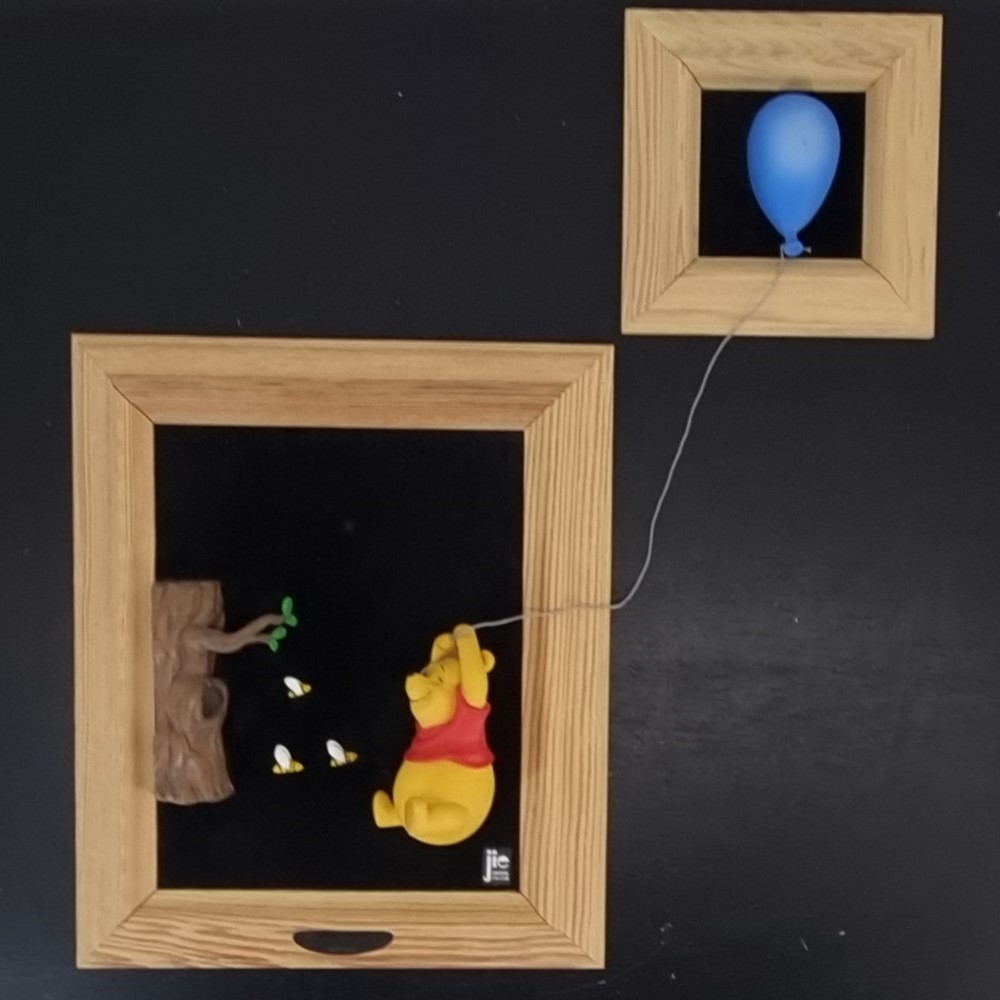 The outer dimension of this Winnie the Pooh artwork is approximately 31 cm in height, crafted from durable resin, and placed in a wooden frame.