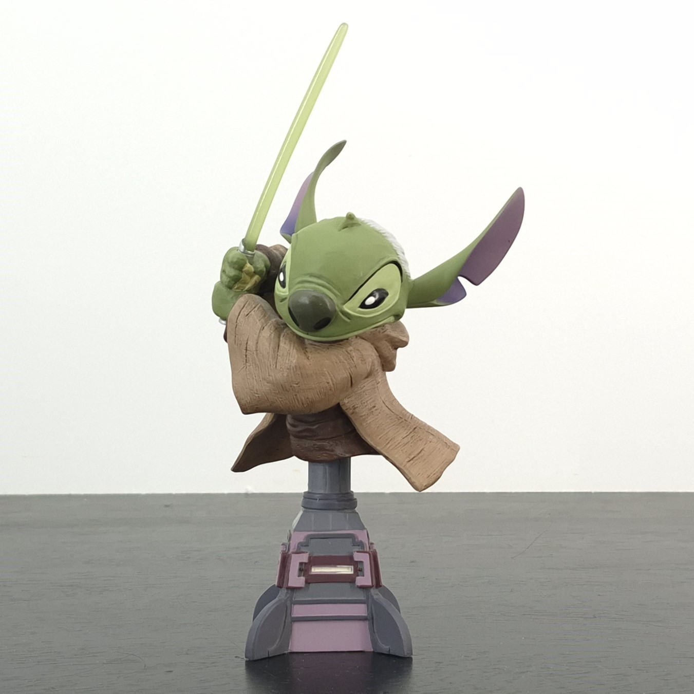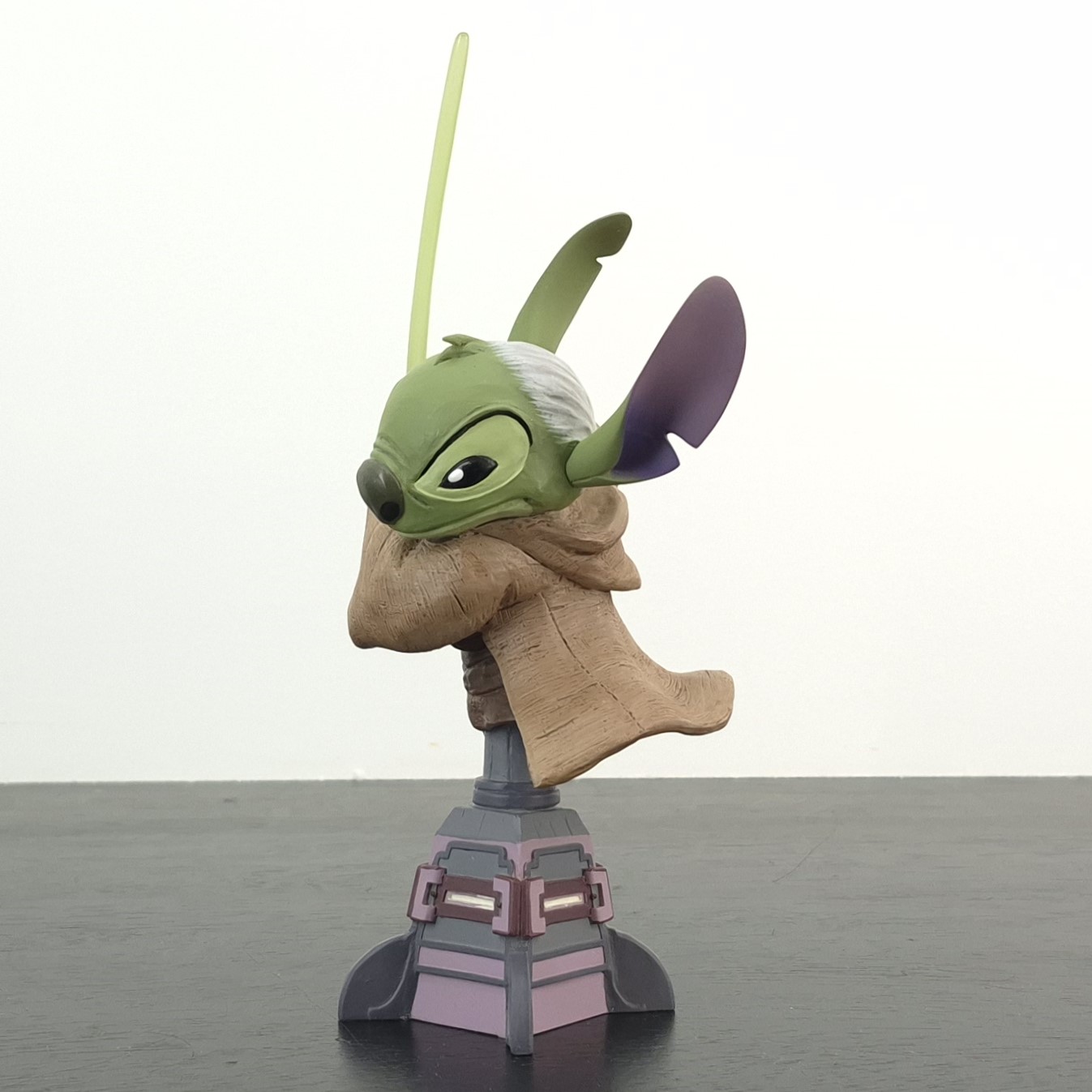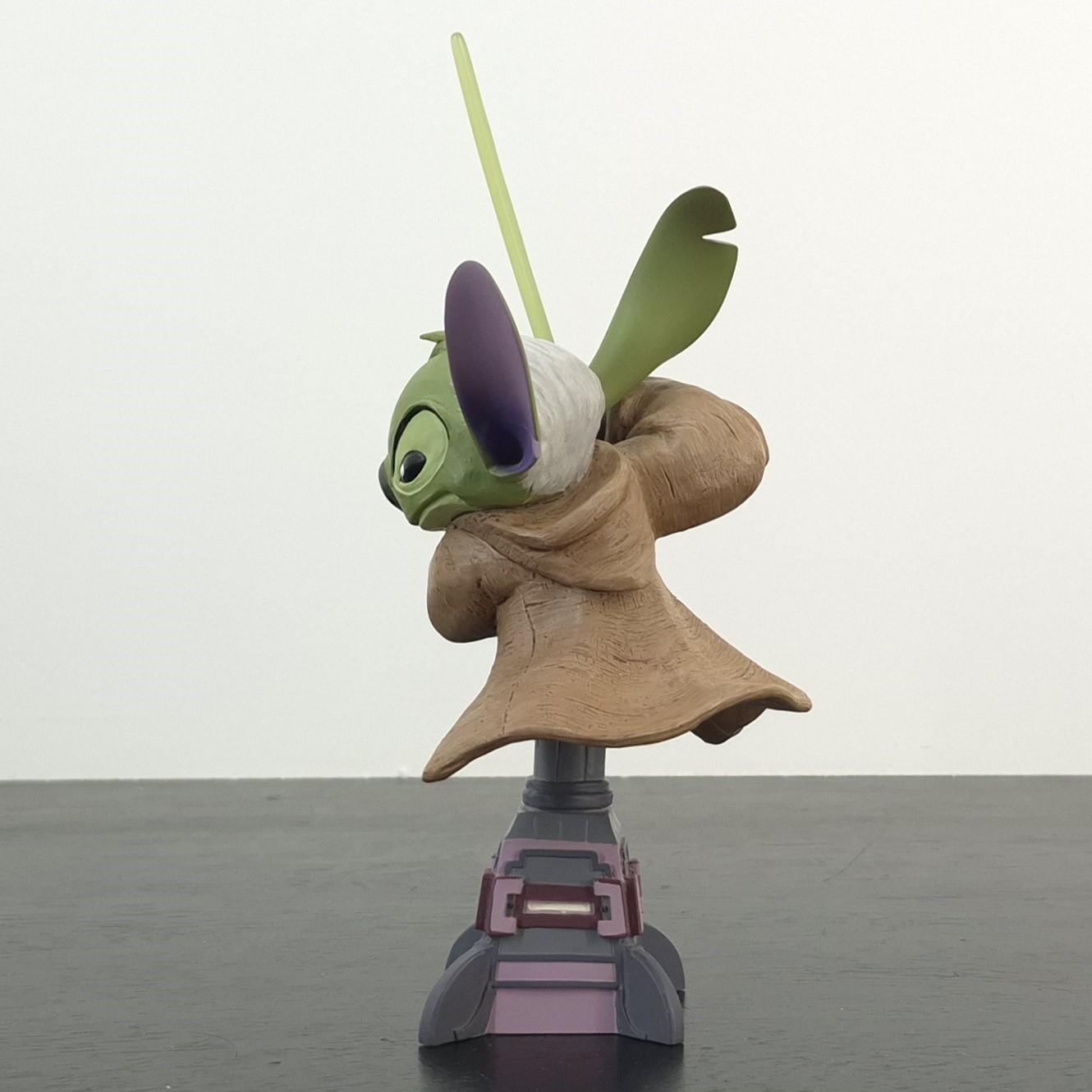 This unique bust from Yoda Stitch was sculpted by Ruben Procopio and designed by Bruce Lau under Walt Disney’s license. It was taken in production by Enesco for their Grand Jester collection. Dates back to 2012. Made from durable resin, it remains in excellent condition. Unveil the epic fusion of two iconic universes with the Stitch as Yoda bust! This striking piece features Stitch, masterfully transformed into Yoda, holding a glowing green lightsaber aloft. Perfect for fans of Disney and Star Wars, this bust captures the mischievous charm of Stitch with the wisdom and power of Yoda.