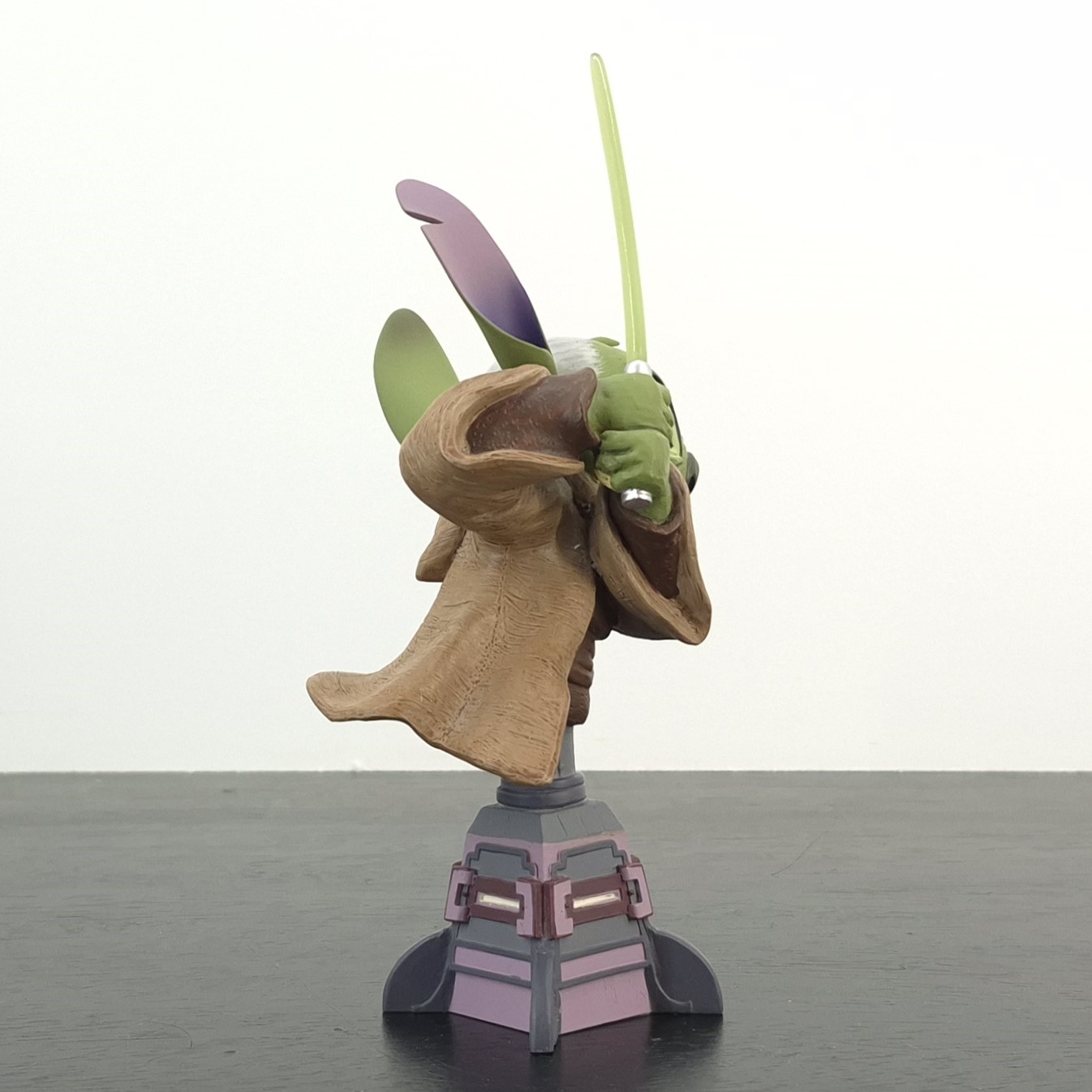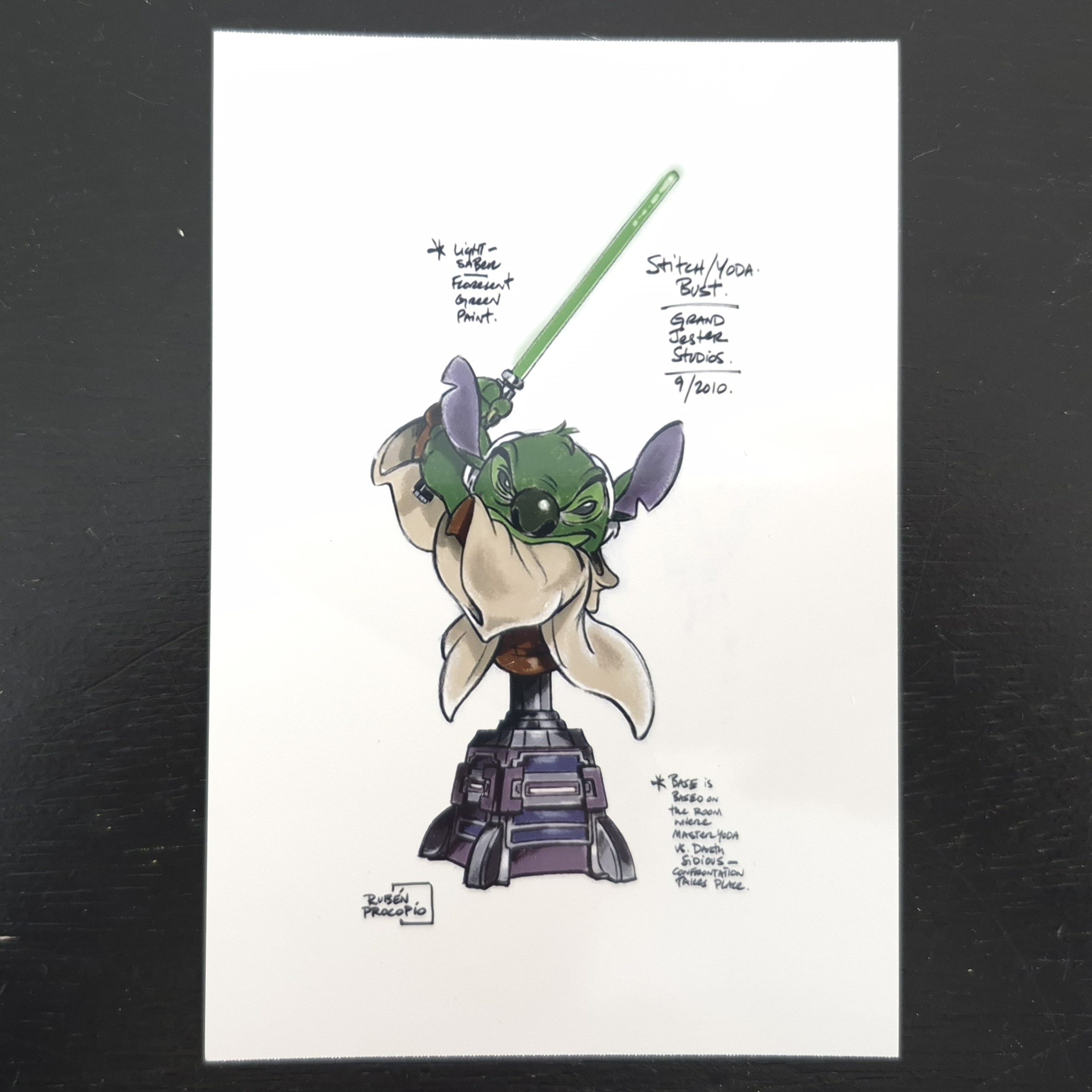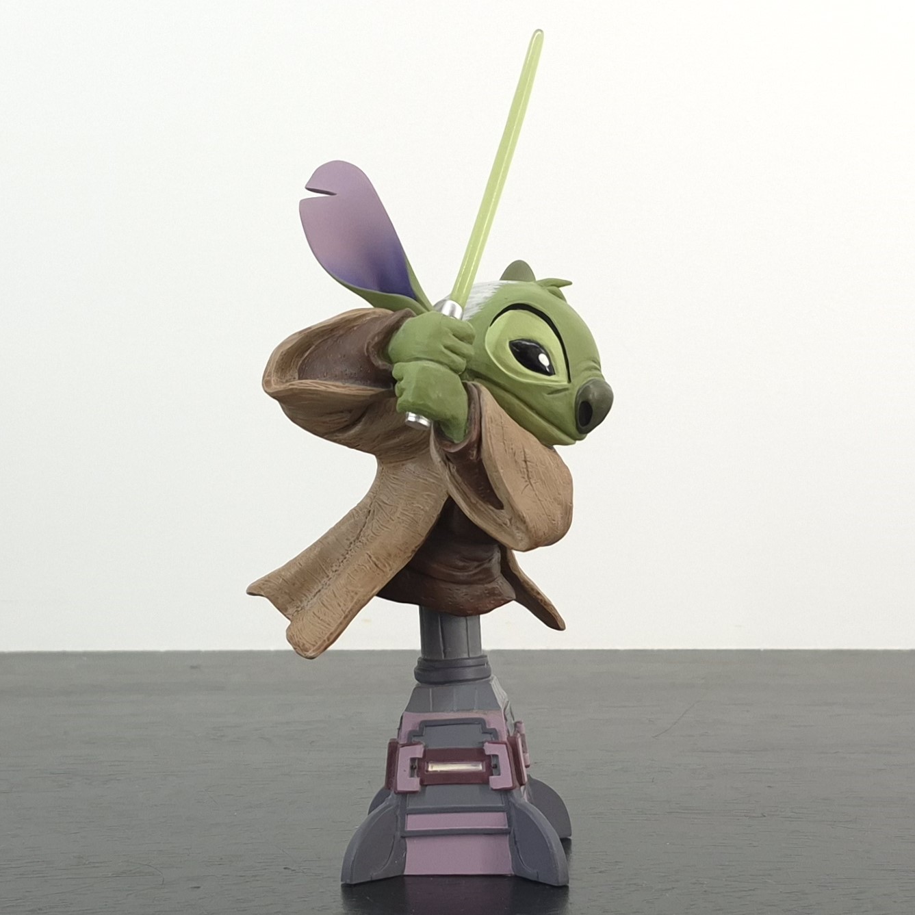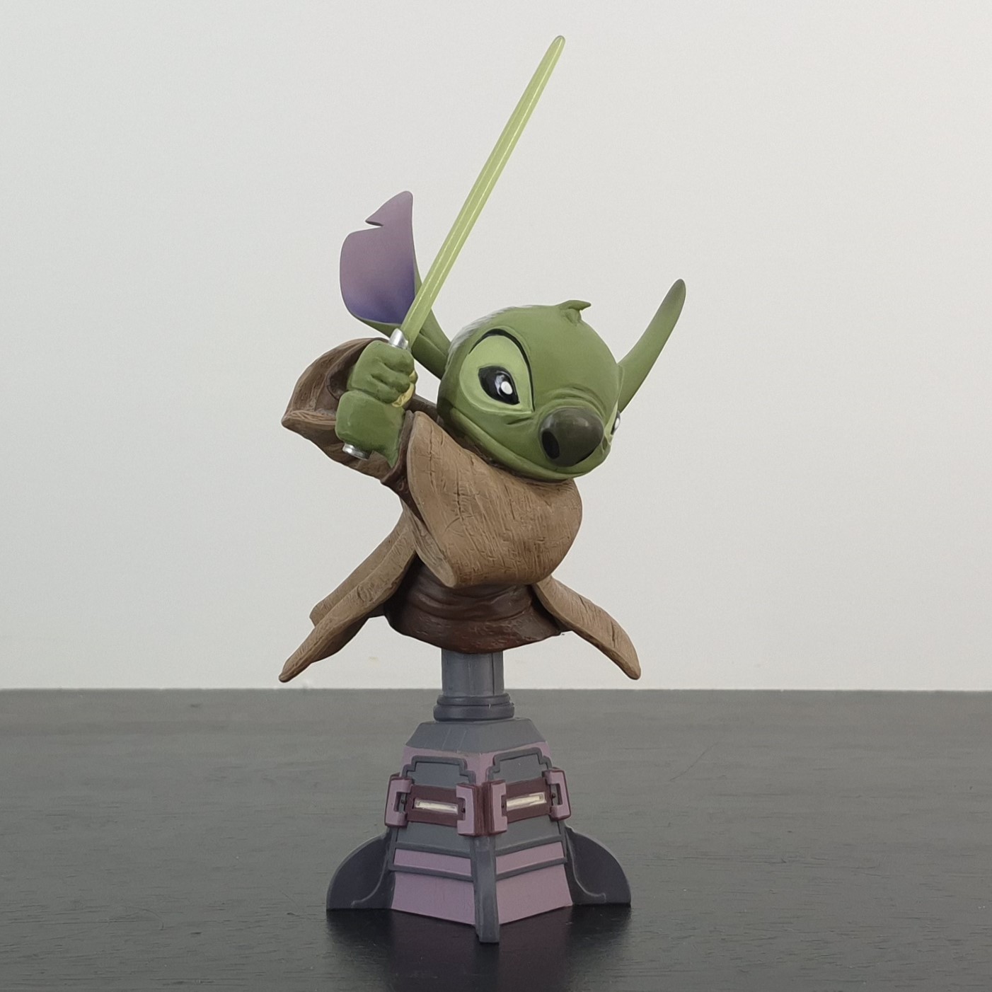 This unique bust from Yoda Stitch was sculpted by Ruben Procopio and designed by Bruce Lau under Walt Disney’s license. It was taken in production by Enesco for their Grand Jester collection. Dates back to 2012. Made from durable resin, it remains in excellent condition. Unveil the epic fusion of two iconic universes with the Stitch as Yoda bust! This striking piece features Stitch, masterfully transformed into Yoda, holding a glowing green lightsaber aloft. Perfect for fans of Disney and Star Wars, this bust captures the mischievous charm of Stitch with the wisdom and power of Yoda.